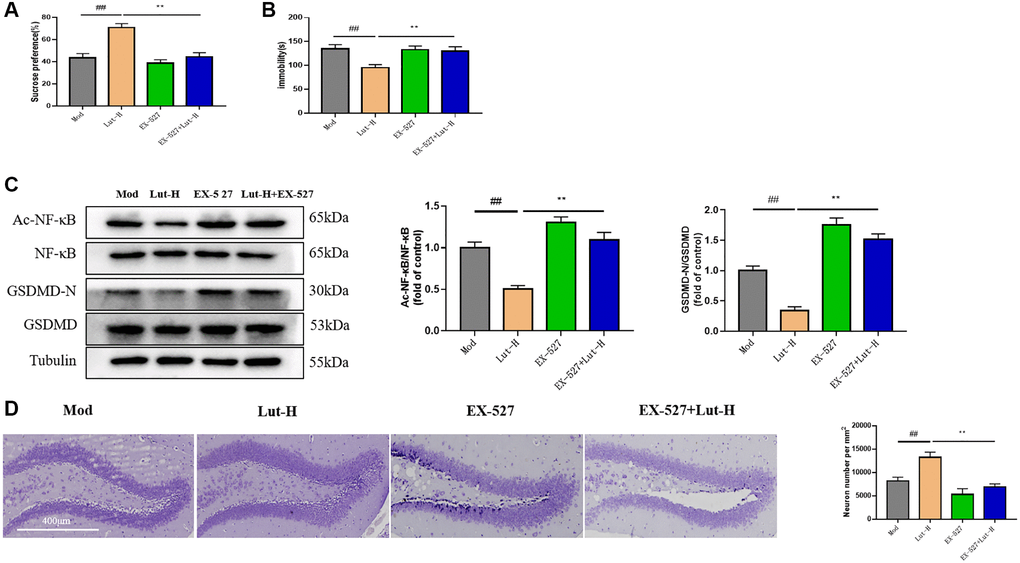 To further investigate the in vivo role of Sirt1 signaling in the antidepressant mechanism of luteolin, we further investigated the mechanism of luteolin against depression-related dry eye disorder using the SIRT1 selective inhibitor EX-527. As shown in the Figure 5A, Sirt1 inhibitor EX-527 inhibited luteolin (10 mg/kg) from improving sucrose preference in mice in SPT (p < 0.01). Unsurprisingly, EX-527 also inhibited the anti-depressive like effect of luteolin (10 mg/kg) in TST. The immobility time of mice was significantly longer when EX-527 and luteolin (10 mg/kg) were used together than when luteolin (10 mg/kg) was used alone (p < 0.01) (Figure 5B). These results revealed that the mechanism of luteolin against pleasure loss and behavioral despair in depressed mice depends on Sirt1 signaling. Give the above, after applying EX-527, we used Western Blot to detect the protein expressions of Ac-NF-κB, NF-κB, GSDMD-N and GSDMD in hippocampus. EX-527 resisted the decreased expression of Ac-NF-κB, NF-κB, GSDMD-N and GSDMD protein in hippocampus treated with luteolin (10 mg/kg) compared to the group treated with luteolin (10 mg/kg) alone (Figure 5C).