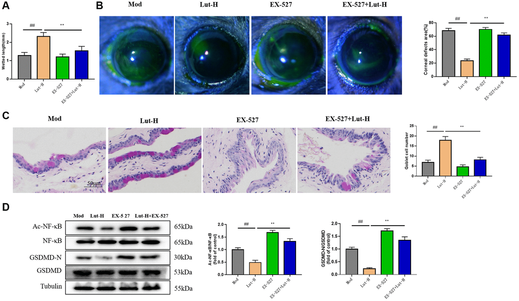 In addition, PAS staining of the conjunctival epithelium showed that EX-527 significantly inhibited the protective effect of luteolin on goblet cells of the conjunctival epithelium (Figure 6C).