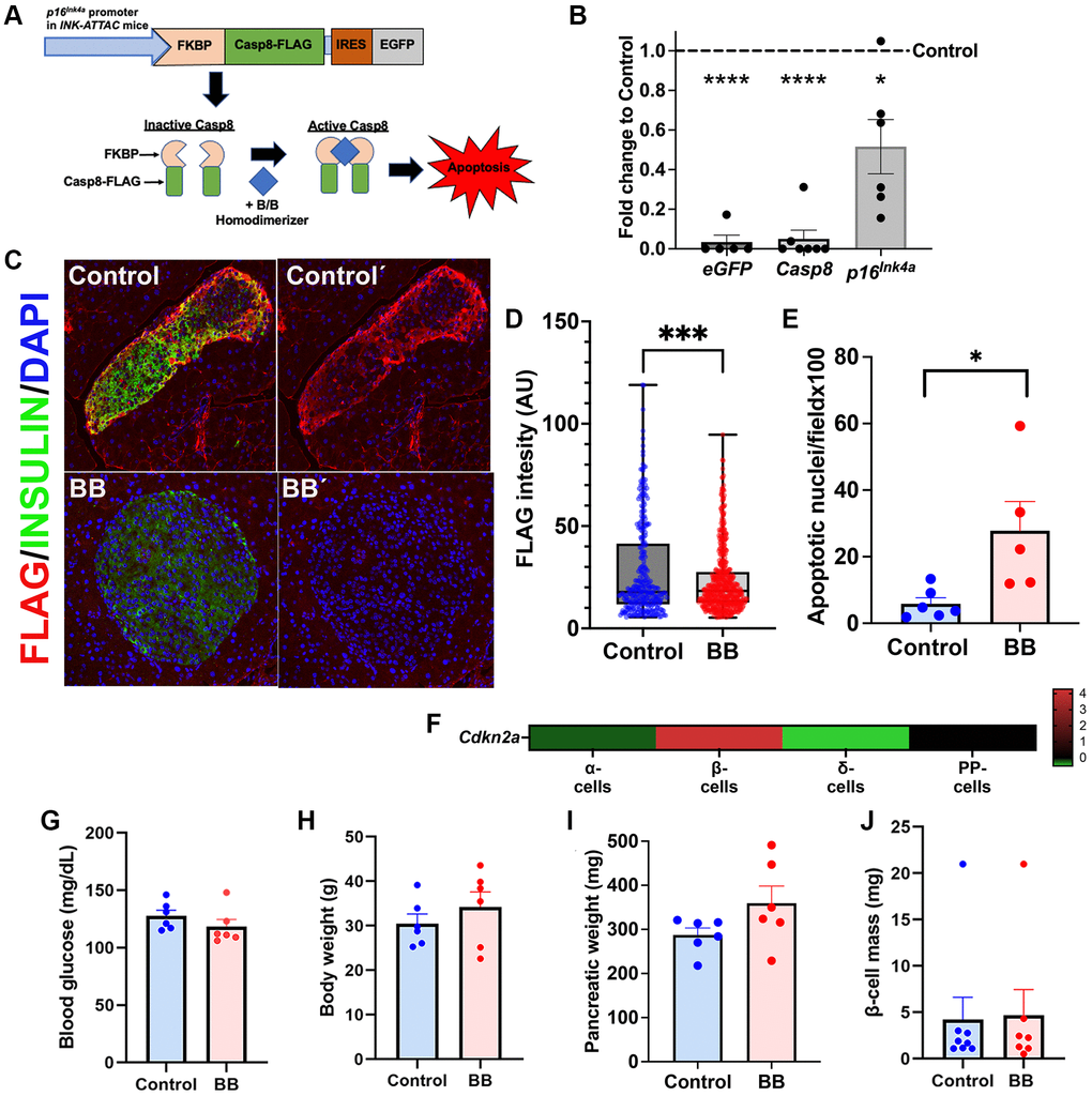 Previously, we showed that with age and insulin resistance, β-cell senescence increased [18, 19] and senolysis (selective deletion of senescent cells) improved β-cell function, gene identity, and blood glucose levels [19]. Additionally, it has been shown that senolysis can preserve β-cells in a model of Type 1 Diabetes [20]. INK-ATTAC mice are a transgenic whole-body FLAG-tagged line that allows specific deletion of cells expressing p16Ink4a upon administration of B/B homodimerizer, a synthetic drug that causes dimerization and activation of the caspase 8 only in p16Ink4a-positive cells [21, 22]. However, whether the elimination of p16Ink4a-expressing beta cells negatively impacts β-cell mass is unknown and whether residual cell proliferation can be rescued by removing local SASP remains to be determined.