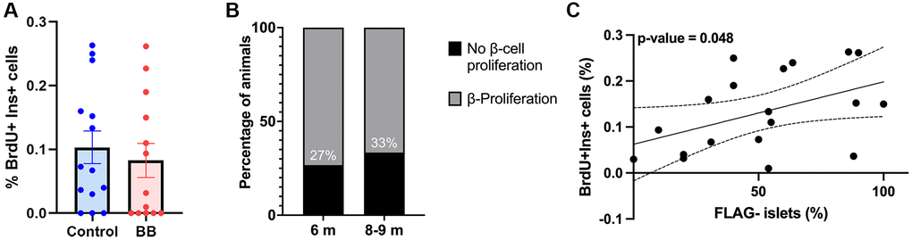 A significant correlation between the proliferation percentage and percentage of non-senescent β-cells was also seen at 12-months of age (Figure 4A) indicating that even at this age, removal of p16Ink4a+ cells can have an impact on beta-cell proliferation.