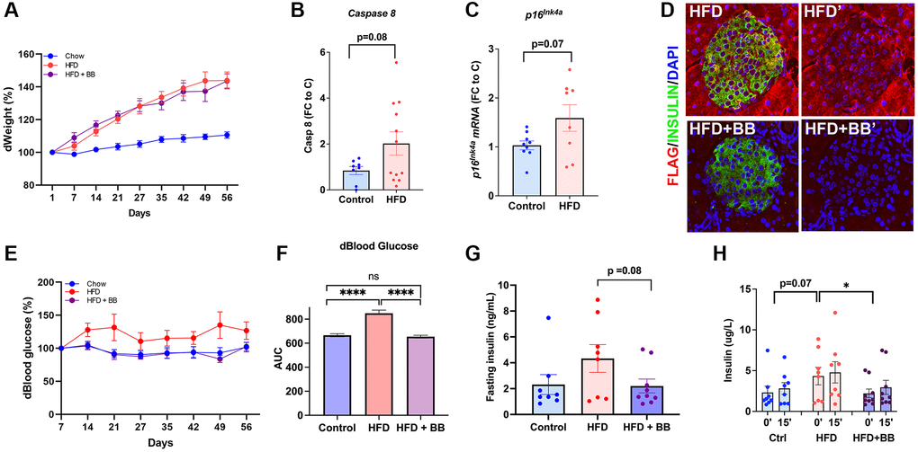 In adult animals, β-cell proliferation is induced by increased metabolic demand. Therefore, the effects of removing p16Ink4a cells in a high-fat diet (HFD) model were evaluated. One-year-old INK-ATTAC animals were maintained on a specific diet for 8 weeks in the following groups: control on a chow diet, HFD only, and HFD with four courses of B/B homodimerizer. Weekly body weight was monitored and showed a significant increase of 19% in both the HFD and HFD with B/B homodimerizer groups (Figure 3A). As previously reported [19], HFD accelerated β-cell senescence, which in this model was indicated as an increased Caspase8 (Figure 3B) and p16Ink4a (Figure 3C) transcript in islets from animals fed a HFD. Representative confocal images of the pancreas from B/B treated animals showed a decrease in FLAG staining (Figure 3D) when compared with those treated with vehicle. HFD diet increased blood glucose by 27%, these levels were restored in the B/B treated group and comparable to chow animals (Figure 3E and 3F). Insulin tolerance test showed no significant differences among the groups (Supplementary Figure 4) even though results were different between males (Supplementary Figure 4A) and females (Supplementary Figure 4B). Fasting hyperinsulinemia was noted in the HFD group and restored after BB treatment (Figure 3G). Similarly, glucose stimulated insulin secretion (GSIS) in vivo during IPGTT, showed increased basal insulin in the HFD treated group which returned to normal after treatment with BB homodimerizer (Figure 3H). These results show that clearance of p16Ink4a in a HFD model partially restored glucose homeostasis.