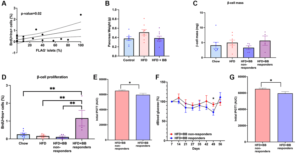 There were no significant differences in pancreatic weight in different treatment groups (Figure 4B). Systematic imaging of pancreatic sections revealed no significant changes in β-cell mass amongst groups (Figure 4C) and overall, clearance of p16Ink4a expressing cells did not change the rate of β-cell proliferation. However, there was a subset of animals treated with B/B homodimerizer where BrdU incorporation was significantly increased and we termed this group “responders” which represented 44% (Figure 4D) of the total treated population. In the remainder 56% of the animals, proliferation did not increase in response to p16Ink4a clearance (Figure 4D). Further analysis comparing the non-responders to the responders revealed that the latter had better glucose clearance in the initial IPGTT (Figure 4E) and maintained overall lower blood glucose levels than non-responders throughout the experiment (Figure 4F and 4G). However, no differences were found between the two groups in the following parameters: gender, initial ITT, weight gain, fed or fasting insulin and fasting blood glucose (Supplementary Figure 5). These results suggest that responders had better β-cell function at the beginning of the experiment but further experiments are required to fully understand these differences.