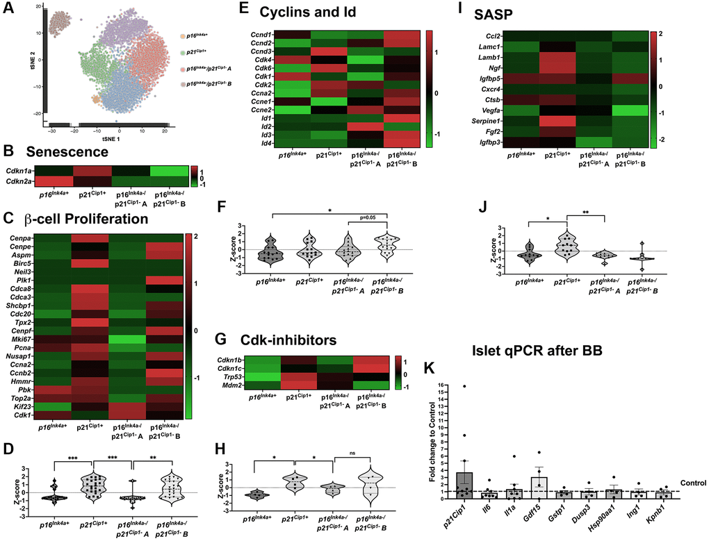 To further understand the lack of effects of the removal of p16Ink4a cells in β-cell proliferation, scRNASeq analysis was performed in previously reported β-cells pooled from control and S961 treated animals [25]. t-SNE analysis revealed β-cell subpopulations that were divided into 6 clusters (Figure 6A). Analysis was concentrated in 4 of these subpopulations (Figure 6B). Two senescent subpopulations: p16Ink4a+, p21Cip1+, and two non-senescent subpopulations: p16Ink4a−/p21Cip1− A and p16Ink4a−/p21Cip1− B. In the INK-ATTAC model, only the p16Ink4a+ cells were removed (Figure 1B) while p21Cip1+ remained unchanged (Figure 6K). scRNASeq allowed further analysis of the proliferative capacity and SASP transcription of these specific cell populations. As previously described, p16Ink4a+ cells were non-proliferating (Figure 6C and 6D) whereas p21Cip1+ and p16Ink4a−/p21Cip1− cells upregulated of proliferative genes (Figure 6C, 6D). We believe that the upregulation of proliferation genes in p21Cip1+ represents a population of growth arrest during early senescence [26, 27]. This is further supported by significant upregulation of Cdk inhibitors (Figure 6G and 6H) in this subpopulation. Other cyclins and Id were significantly upregulated in the p16Ink4a−/p21Cip1− B subpopulation (Figure 6E and 6F). scRNASeq data was further inquired for the transcriptome of SASP factors known to be upregulated in β-cells (Figure 6I and 6J). These changes were confirmed by performing qPCR on islets from BB homodimerizer treated animals. The main SASP-producing β-cell subpopulation was the p21Cip1+ which persisted in the islets from mice treated with BB (Figure 6K).