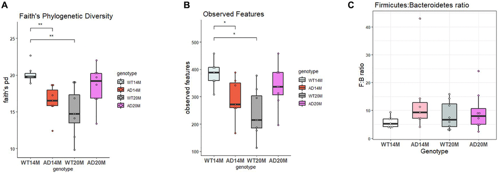 To assess the richness and diversity of the samples, alpha diversity measures was examined. Faith’s phylogenetic diversity and Observed ASV’s were the 2 metrices calculated and comparisons were done to assess both the genotypic changes and age-related changes. The 14-month-old Tgf-344AD rats showed a decrease in both metrics (Figure 1A, 1B), faiths PD and observed Features (Kruskal Wallis test; p = 0.0054 and 0.05; Tables 1 and 2), and at the 20-month time point, this was found to be reversed. The WT control rats showed a steep decrease in both alpha diversity metrices at 20 months of age. There was increased diversity in the Tgf344-AD rats when compared to WT control rats (p = 0.09 and 0.07; Tables 1 and 2) at 20 months of age but it was not statistically significant. The age-related decrease in both diversity and number of observed ASV’s for the WT animals was significant (p = 0.005 and 0.033; Tables 1 and 2) while for the AD rats there is a tendency towards an increase, but it was not statistically significant. The Firmicutes: Bacteroidetes (F:B) ratio has been viewed as a biomarker of intestinal homeostasis and frequently observed with obesity. The Tgf344-AD rats did not show any changes in the Firmicutes:Bacteriodetes ratio when compared to WT control rats at both the ages (Figure 1C).