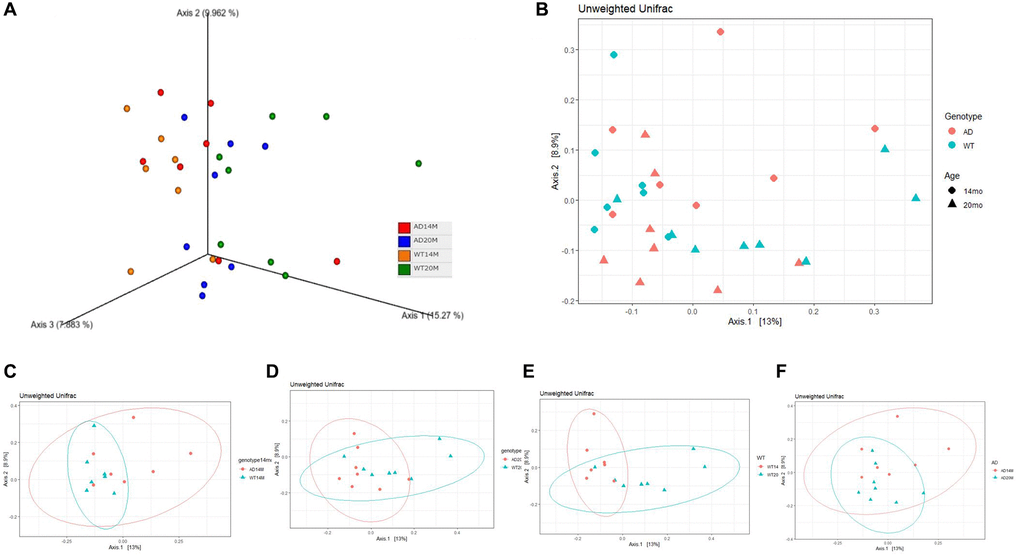 To assess the similarity between the overall microbial communities of the groups, Beta diversity indices was calculated using the Unweighted Unifrac distance metric. The three-dimensional visualization of the community structure was done using Principal Coordinates analysis plot (PCoA) carried out using pairwise Unweighted Unifrac distances (Figure 2A). There was a striking change in the microbiota community structure between middle aged and old age animals (Figure 2A–2D). Permutational multivariate analysis of variance (PERMANOVA) was carried out on the distance between groups to analyze if the variation was of statistical significance. The age- related changes was statistically significant for the WT group (p = 0.012; Table 3) and showed a trend in the AD group (p = 0.078; Table 3) (Figure 2C, 2D). The genotypic changes (Figure 2E, 2F) were not found to be statistically significant.