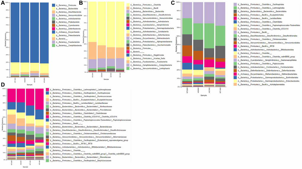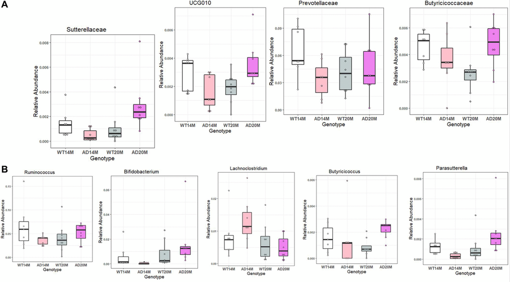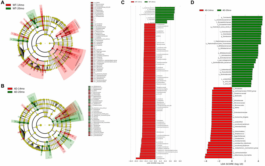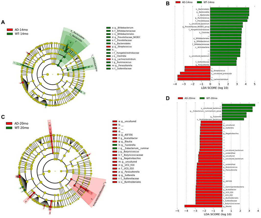 To determine the changes in the gut microbial communities occurring due to Alzheimer’s disease phenotype and aging, LEfSe was performed (Figure 4A, 4C). Bacterial taxa was found to be changed between AD and WT groups at different levels of taxonomic classification starting at the Phylum level. At the Phylum level, Bacteroidota was decreased in AD rats at 14 months of age (Figure 4B, 4D). At the Class level, Bacteroidia and Actinobacteria were decreased in AD rats at 14 months of age. At 20 months of age, Gammaproteobacteria was increased in the AD rats group. At Order level, Bacteroidales, Clostridia and Bifidobacteriales were found to be decreased at 14 months of age while Burkholderiales was increased at 20 months of age. Some of the prominent family level genotypic changes were Prevotellaceae decreasing in AD group at 14 months and UCG_010, Sutterellaceae, Butyricicoccaceae increasing at 20 months (Figure 5A). The prominent genotypic changes at the genus level was a decrease in Ruminococcus, Bifidobacterium, Parasutterella and increases in Lachnoclostridium at 14 months of age (Figure 5B). At 20 months of age, a prominent change was Butyricicoccus which was increased.