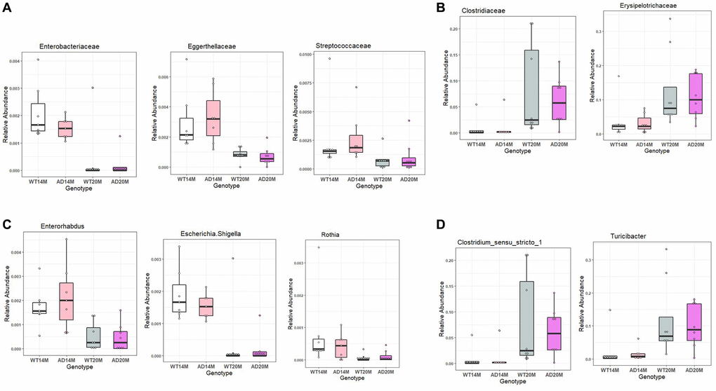 Some of the prominent changes at the Family level were Enterobacteriaceae, Eggerthellaceae and Streptococcaceae decreasing in both the WT and AD rat groups with age while Erysipelotrichacae and Clostridiaceae were increased in both the rat groups with age (Figure 7A, 7B).