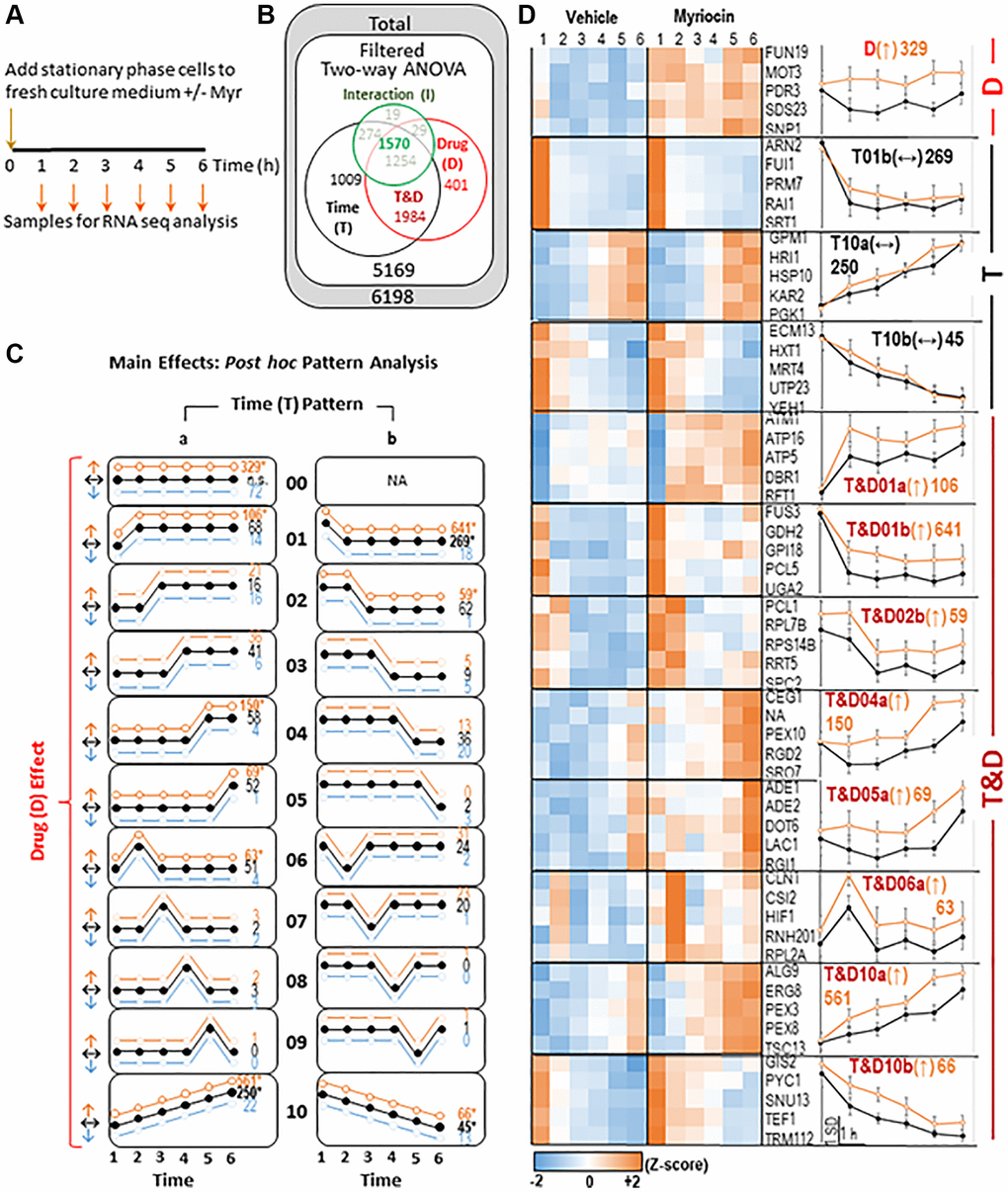 To examine transcriptional changes induced by Myr treatment, we diluted stationary phase prototrophic BY4741 cells (50–60% of cells synchronized for first two cell cycles over a 6 h time frame [7]) into fresh culture medium (Time 0), with and without Myr treatment. Samples for analysis of mRNA abundance by RNA seq were taken at 1 h intervals over a 6 h time course (Figure 1A). The normalized RNA seq data for the time course contained transcripts, expressed as transcripts per million (TPM), mapped to 6198 genes, 5169 of which were uniquely annotated and of sufficient signal intensity for subsequent analysis (Supplementary Table 1, Filter tab). Filtered data were analyzed by two-way ANOVA with a statistical cutoff of p = ≤ 0.01 to give a set of 4964 significant genes (Figure 1B). These were further sorted into drug (D), time (T), both time and drug (T&D) and Interactions (I) (Figure 1B, Euhler diagram), and assigned a p-value. Genes found to be significant in any of these three categories are referred to as differentially expressed (DEG).