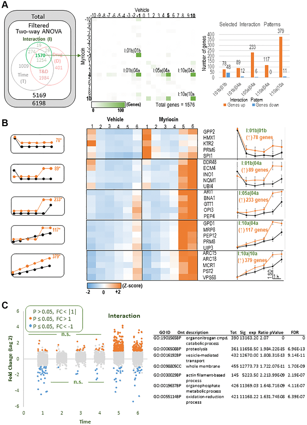 Next, we analyzed the 1570 genes in the Interaction group for temporal patterns responding to Myr treatment (Figure 2A). Five patterns contained more than 100 DEGs (Figure 2A, center panel, numeric results for this grid are available in Supplementary Table 1, tab called ‘I intersections’). The right-hand graph in Figure 2A indicates the number of up- and down-regulated genes in these 5 patterns. Five templates for these patterns (Figure 2B, left-side graphs) along with heatmaps of representative genes in each pattern for Vehicle and Myriocin treated samples are shown in Figure 2B (center panels). The right-most panels in Figure 2B represent average Z-scored gene expression profiles for the 5 patterns examined. Both the heatmaps and the data plots on the right side of Figure 2A reveal that Myr treatment enhances transcription at the 5 and 6 hour time points. This observation was tested by examining all genes found to be significant by the two-way ANOVA’s in the interaction term. For this test we plotted the log 2-fold changes of Myr treatment/vehicle treatment at each time point and color-coded the results if they were significantly down-regulated (blue) or up-regulated (orange) (p ≤ 0.05, pairwise Fisher’s LSD). As predicted, the predominant effect of Myr was to upregulate genes at the 5 and 6 h time points (Figure 2C). Functional overexpression analysis of significant DEGs at these two time points (called: I: 5 and 6(↑)) revealed a more generalized picture of the biological processes and cellular compartments responding to Myr (Figure 2C, right panel, all genes listed in Supplementary Table 2). As we discuss in detail below, up-regulation of genes starting between the 4th and 5th hour occurs when the majority of cells enter their second cell division cycle [7]. Thus, these data explain much of the effect of time and drug components within the interaction gene set.