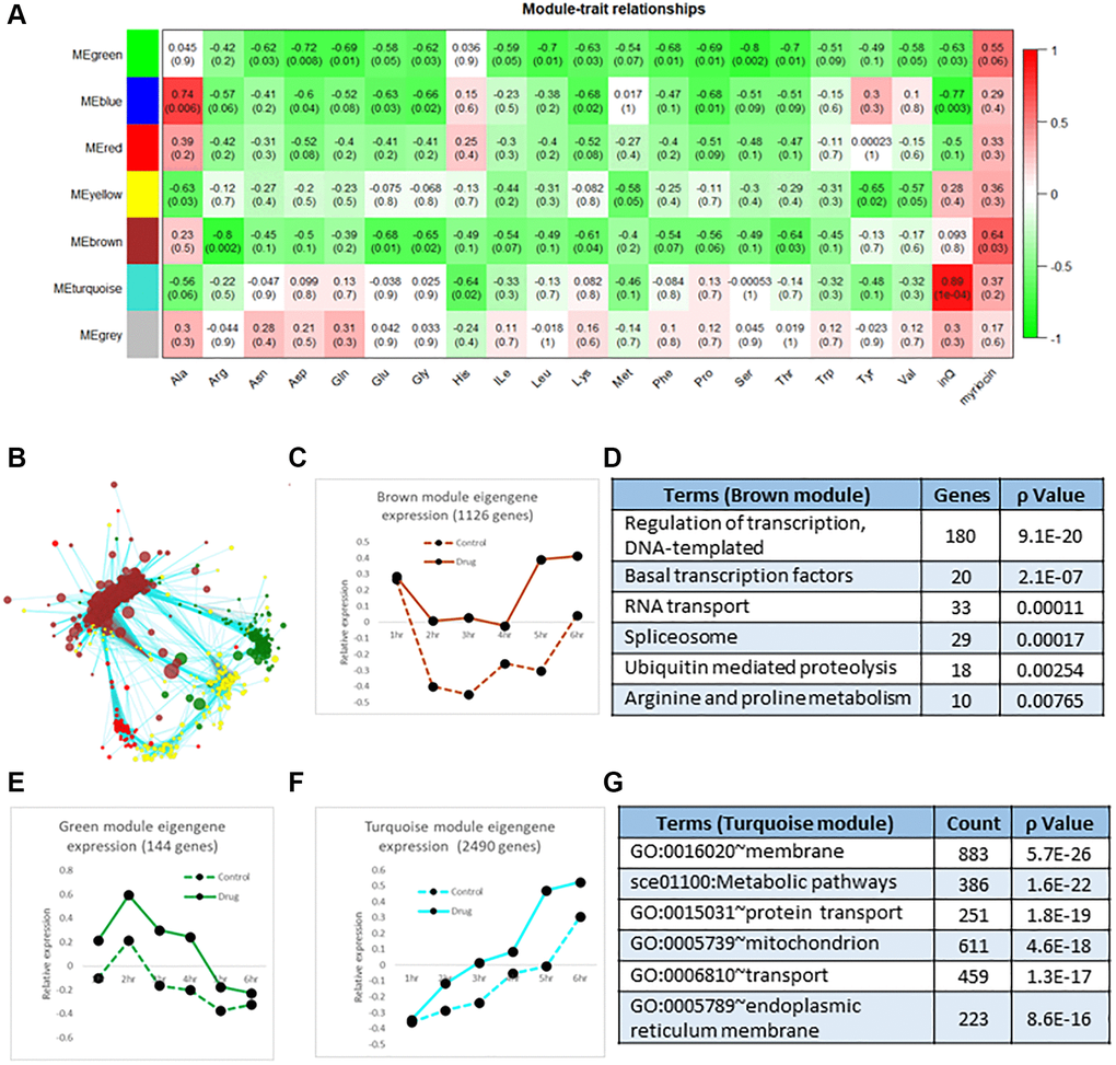 As another approach to understand effects of Myr on the transcriptome, we analyzed transcript data using the R program package of Weighted Gene Correlation Network Analysis, WGCNA [28], to identify clusters (modules) of highly correlated genes showing a similar response to Myr over the 1–6 h time course. A gene dendrogram produced by average linkage of hierarchical clustering revealed many modules with the seven most correlated having from 18 to 2490 genes (Supplementary Table 3, column L in Cluster Analysis tab, see also the Module Eigengenes tab). We then examined the relationship of these gene modules to free amino acid pools over the same 1–6 hr time course as an alternative way to determine if transcription played a role in lowering or maintaining smaller amino acid pools in drug-treated cells as we had previously found [7]. Results of this analysis are presented in Figure 3A as a heatmap plot. For amino acids (abbreviation shown on the X-axis), the numbers in a column represent the correlation p-value and the correlation (in parentheses) between a module eigengene (ME, Y-axis) expression value and an amino acid level. Here a ME corresponds to the first principal component of the expression matrix of the module. The ME can be considered the most representative gene in a module and, as used here, it represents the average effect of Myr on genes compared to the untreated drug control (Supplementary Table 3, Module Eigengenes tab). The heatmap shows that the Brown and Green modules with 1126 and 144 genes, respectively, have the greatest negative correlation to Myr treatment. That is, Myr maintains low pool levels but enhances the level of a transcript at one or more time points. The values in the ‘InQ’ column of the heatmap represent the correlation p-value and correlation value (parentheses) between the module eigengene expression and incubation time course (1–6 h). For these association calculations, the control (no drug) samples were set as 0 and Myr-treated samples were set as 1. Thus, the MEturquoise row has a strong correlation with time (Figure 3A, column inQ) as shown graphically in Figure 3F. The values in the 'myriocin' column represent the association between the module eigengene expression and the absence/presence of Myr and they indicate that the Green and Brown MEs are the most negatively correlated MEs.