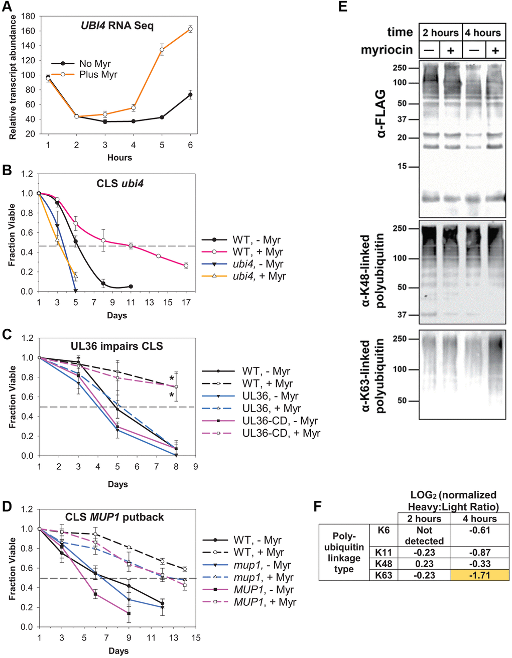 To confirm this result, and to resolve other linkage types, we performed stable isotope labeling with amino acids in cell culture (SILAC) on yeast cells and subjected heavy-labelled and light-labelled cells to mock-treatment and Myr-treatment, respectively. At 2 hours and 4 hours of treatment, we collected cells, prepared lysates, and affinity purified FLAG-ubiquitin, followed by mixing, tryptic digestion, and processing of peptides for analysis by mass spectrometry. This SILAC-MS analysis resolved various peptides corresponding to the different linkage types of ubiquitin polymers, including K6-linked, K11-linked, K48-linked, and K63-linked polymers. Interestingly, we detected only modest changes in linkage types after 2 hours of Myr treatment, while 4 hours of Myr treatment resulted in increased formation of several polymer types, most notably for K63-linked ubiquitin polymers (Figure 4F). This finding is consistent with the immunoblot results shown in Figure 4E, confirming that yeast cells increase the formation of K63-linked ubiquitin polymers in response to Myr treatment. Taken together, these results suggest that yeast cells respond to Myr treatment by remodeling ubiquitin pools, partly by increasing production of ubiquitin via transcription of UBI4 and partly by deploying existing ubiquitin pools to promote increased formation of K63-linked ubiquitin conjugates.