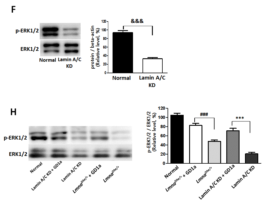 This article has been corrected: The authors found that Western blot images of p-ERK1/2 and ERK1/2 in Figure 4F were from different experiment with protein extracts from LmnaDhe/+mice. They replaced the incorrect images with the images of p-ERK1/2 and ERK1/2 in MSC protein extracts from normal and Lamin A/C knockdown (KD) mice. In Figure 4H, the authors corrected a typo where “p-ERK1/2” was mislabeled “p-REK1/2”. The authors also revised the Figure legend for Figure 4F and 4G as follows: “(F) Lamin A/C was knocked down in mouse MSCs using siRNA. (G) Primary MSCs with LmnaDhe/+ mutation were isolated from LmnaDhe/+ mice.” These corrections have no impact on the experimental outcome or conclusions.