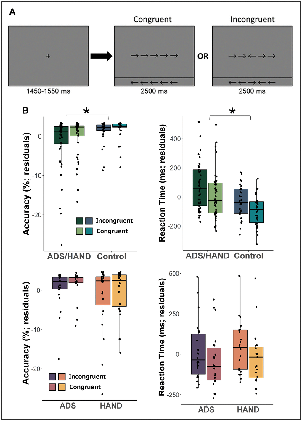 During MEG recording, participants were seated in a nonmagnetic chair within a magnetically-shielded room and were monitored by study staff using a real-time audio-video feed from inside of the shielded room. Participants’ hands rested on a shelf attached to the chair and their right hand was positioned over a response glove that included a button for each of the second through fifth digits, although participants only used the buttons for the second and third digit (i.e., index and middle finger). Each participant performed 200 total trials of an arrow-based Eriksen flanker task (Figure 1) [36, 38]. Each trial began with a fixation cross that was presented for a variable duration of 1,450 to 1,550 milliseconds (ms), followed by a row of 5 arrows for 2,500 ms. Participants indicated whether the middle arrow was pointing to the left (right index finger) or right (right middle finger) as soon as possible following the onset of the target. Trials were pseudorandomized and equally divided between congruent and incongruent conditions, with left and right arrows being equally represented in each of the conditions. Trials with a reaction time 2.5 standard deviations (SDs) above or below each participant’s mean were excluded prior to averaging. Two by two ANCOVAs, controlling for the effect of age, were used to probe for group and condition differences in reaction time and accuracy. We first compared the behavioral metrics in healthy controls to those of patients (HAND + ADS) to identify commonalities across the diseases and then followed-up with ADS versus HAND comparisons to isolate disease specific deficits.