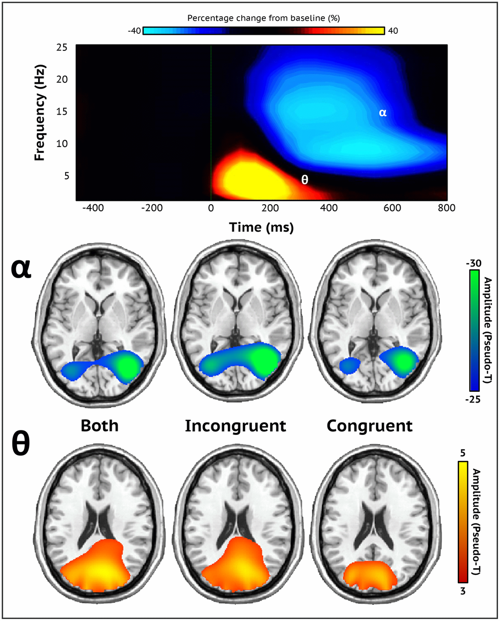To identify the cortical regions generating these oscillatory responses, each significant time-frequency bin was imaged with a frequency-resolved beamformer for both conditions combined (e.g., incongruent and congruent) and each condition independently. The subsequent images were averaged across all participants per time-frequency response for incongruent and congruent conditions separately, as well as for both conditions together (Figure 2). These images indicated that the robust increases in theta activity were generated by populations of neurons in the bilateral visual cortices, while the strong decreases in alpha were distributed across lateral occipital regions bilaterally and right superior parietal cortices.