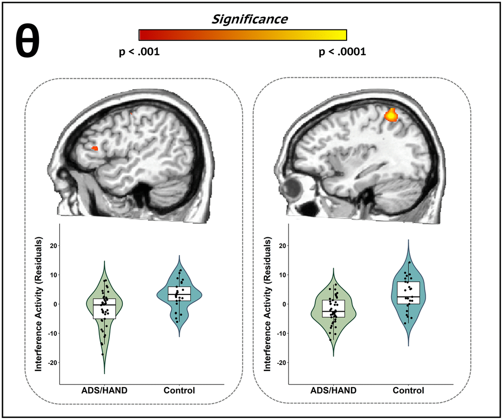 Beyond the general differences between patients and controls, we found disease-specific theta alterations in several brain regions including the prefrontal, parietal, occipital, and temporal cortices. Theta aberrations have been highlighted in previous studies as markers of cognitive impairment separately in AD and HAND [27, 29, 40, 44, 45]. These disease-specific differences in theta oscillatory activity may suggest more fine-scale neurophysiological differences in temporal segmentation and higher order allocation of attentional resources, which could be secondary to regional amyloid accumulation in those on the ADS relative to HAND, as multiple studies have shown normal amyloid levels in patients with HAND [6, 8]. Further, aberrations in theta activity have also been linked to tau accumulation [46] in ADS cases, which is known to follow major amyloid accumulation. Although the cause of neural and cognitive deficits in HAND is uncertain, persistent neuroinflammation, mitochondrial dysfunction, and accelerated aging are all thought to play a major role [47–53], which separately or together may lead to altered theta oscillatory dynamics in attention circuitry. Regardless, our results suggest that theta oscillations are differentially affected across a network of brain regions in ADS compared to HAND, with the latter group exhibiting sharply decreased theta neural interference effects.