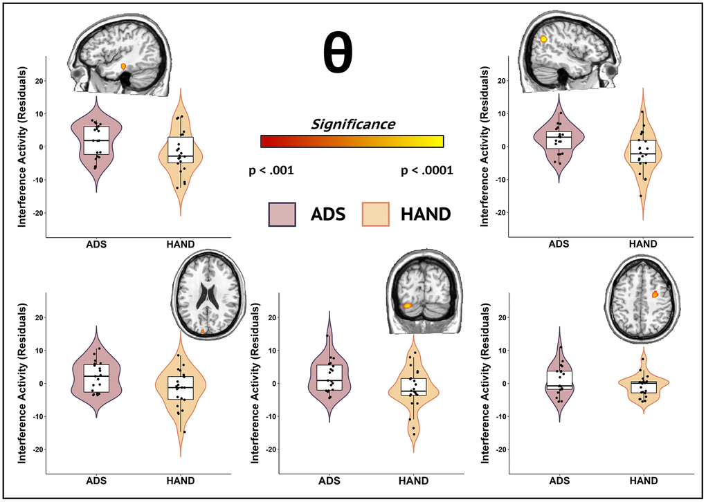 To identify disease specific oscillatory aberrations (i.e., ADS vs. HAND), we utilized a whole-brain exploratory approach on the theta and alpha interference maps. Our key findings indicated that those in the ADS group exhibited stronger theta interference effects compared to participants in the HAND group (p < .001, corrected; Figure 4) across multiple cortical regions, including the left middle temporal gyrus, right superior parietal cortex, left middle occipital area, left lingual gyrus, and right dorsolateral prefrontal cortex. Alpha interference activity did not statistically differ by group in any region.