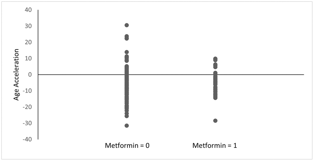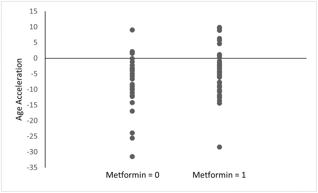 To investigate whether subjects with history of metformin use had slower “age acceleration” than subjects without history of metformin use, we submitted the raw DNA methylation beta values to a publicly available tool, which includes the Horvath [55] method. The calculated output was the difference between the DNA methylation age and the chronological age.
