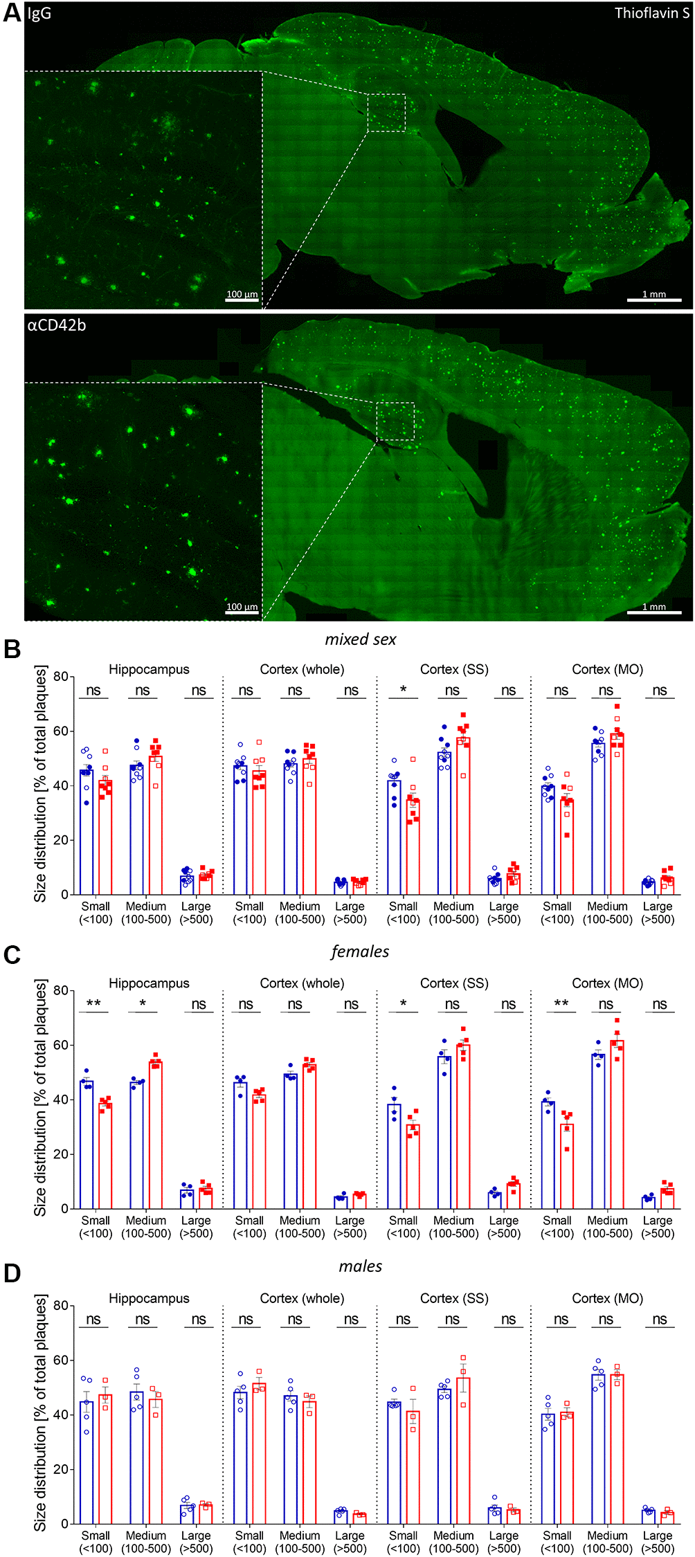 Female mice are reported to tolerate thrombocytopenia better than males [39]. To assess whether female and male APP-PS1 mice reacted differently to αCD42b injections, we investigated sex-specific effects on hematological parameters, body weight and platelet depletion efficiency in brain tissue. Females and males showed similar hematological changes in response to the treatment (Supplementary Tables 1, 2). Females in both experimental groups showed weight loss (Supplementary Table 2), whereas only platelet-depleted males lost weight during the experiment. The efficiency of platelet depletion in the brain was similar between females and males, with platelet-depleted mice showing about 97% lower platelet numbers in the brain compared with sex-matched IgG treated mice (hippocampus: females: IgG = 920.3 ± 528.9 platelets/mm3 versus αCD42b = 26.6 ± 10.88 platelets/mm3; males: IgG = 563.4 ± 473.8 platelets/mm3 versus αCD42b = 16.67 ± 5.51 platelets/mm3).