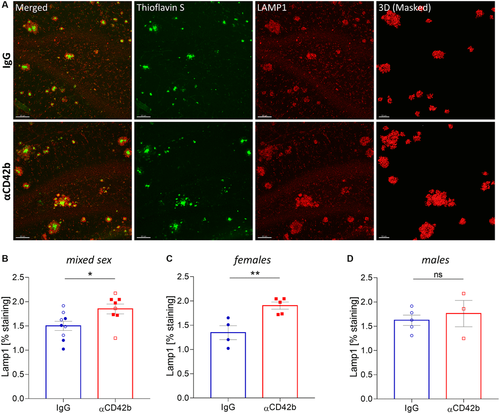 Neuritic pathology correlates with amyloid plaque size, such that larger plaques are accompanied by higher amounts of dystrophic neurites [9, 46]. Thus, we decided to analyze whether platelet depletion also affected dystrophic neurites. For that, we immunolabelled brain tissue for lysosome-associated membrane protein 1 (LAMP1) - a lysosomal protein highly enriched in dystrophic neurites and a common marker of neuronal dystrophy [9, 47] - and quantified the volume of LAMP1+ clusters around thioflavin S+ plaques in the hippocampus (Figure 3A). Platelet-depleted mice showed a significant increase in plaque-associated neuritic dystrophy compared with IgG treated controls (Figure 3B). However, when we analyzed sex-specific effects, only females showed significantly increased levels of neuritic dystrophy with platelet depletion (Figure 3C, 3D).