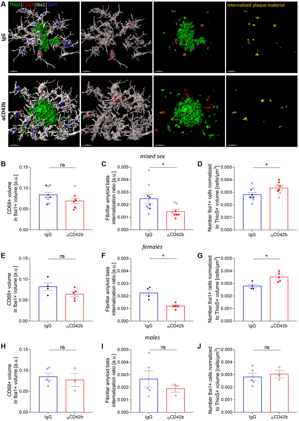 In AD, microglial cells cluster around amyloid plaques, where they actively phagocytose fibrillar amyloid beta and modulate plaque compaction, thereby preventing neuronal damage [11, 12, 48, 49]. Given the effects of platelet depletion on amyloid plaque pathology and neuritic dystrophy, we decided to investigate whether microglial function was altered. We used confocal imaging and 3D surface rendering to measure the microglial cargo of thioflavin S-labelled plaque material [48, 50, 51]. For that, we volumetrically quantified the signal of thioflavin S+ colocalized within CD68-immunolabeled phagolysosomes of plaque-associated Iba1+ microglia in the hippocampus (Figure 4A–4J). Microglia from platelet-depleted mice showed similar CD68+ phagolysosome volume (Figure 4B) compared with control mice but lower amounts of internalized amyloid plaque content (Figure 4C) and increased numbers of plaque-associated Iba1+ microglia (Figure 4D). When analyzing sex-specific effects, we observed the same effects in platelet-depleted females (Figure 4E–4G), whereas males showed no statistically significant differences between experimental groups (Figure 4H–4J).