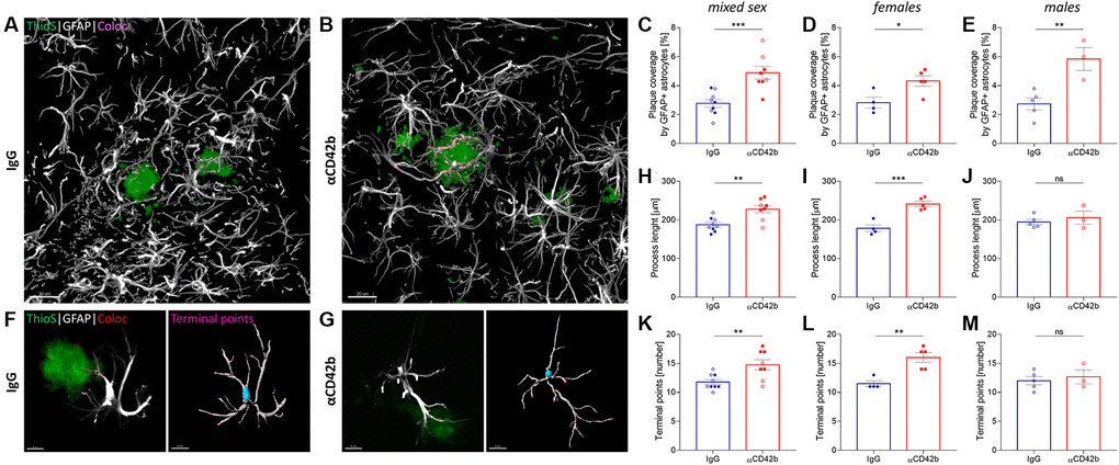 Alongside microglia, astrocytes also play a key role in amyloid plaque dynamics. Hypertrophic astrocytes enwrap and invade amyloid deposits with their processes [52], limiting plaque growth and neuritic dystrophy [53]. To analyze the impact of platelet depletion in the astrocyte-plaque interaction, we used colocalization studies and 3D surface rendering to assess the overlap between GFAP immunolabeled astrocytes and thioflavin S+ plaques (Figure 5A–5E) and the morphology of plaque-associated astrocytes (Figure 5F–5M). Platelet-depleted mice showed increased coverage of hippocampal thioflavin S+ plaques by astrocytic processes (Figure 5C–5E) and a higher total astrocyte process length and branching (i.e., number of branch endings) compared with control mice (Figure 5H, 5K). However, analysis of sex-specific effects revealed significant differences in astrocyte morphology only in females (Figure 5I, 5J, 5L, 5M).