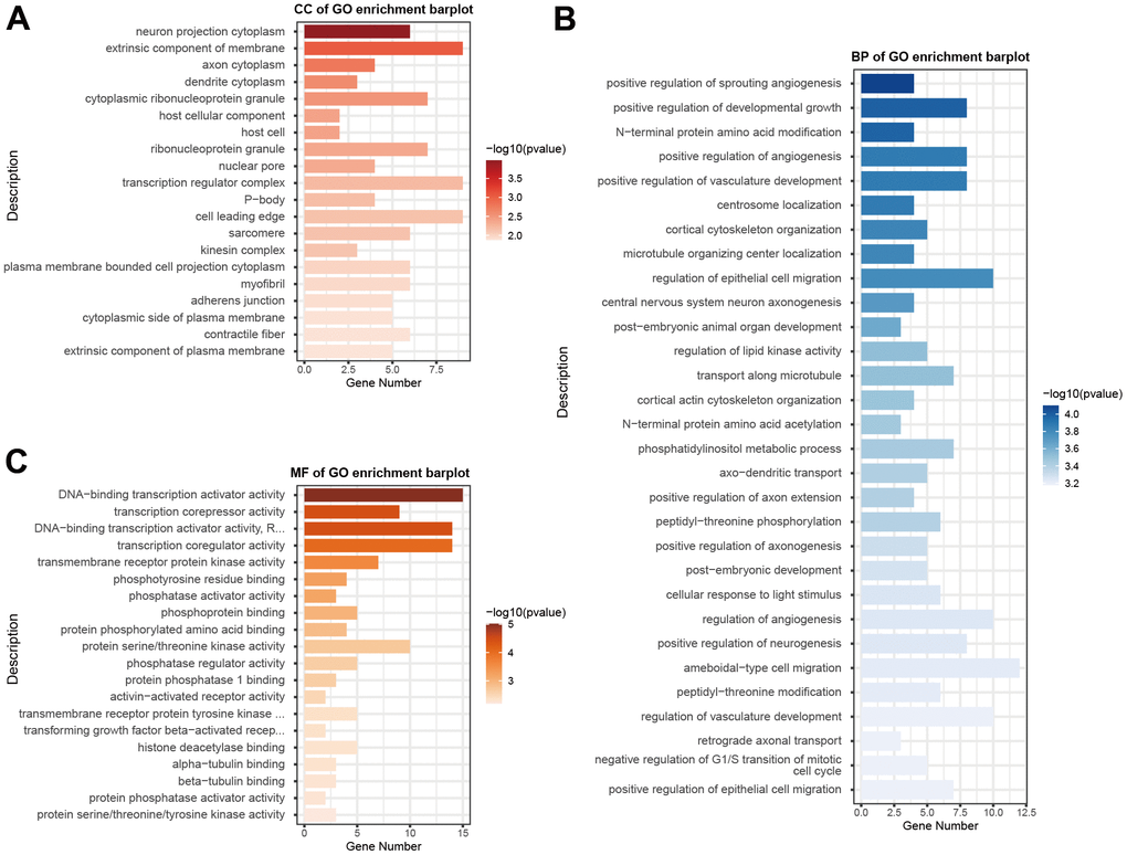 The GSE93883 dataset was used for differentially expressed microRNA analysis based on microRNA arrays, including six healthy and six osteoporotic samples. By setting the cutoff as a log2 fold change of > 1 and a P value of < 0.5, a total of 123 microRNAs were differentially expressed (Figure 1A, 1B). Among these microRNAs, hsa-MiR-181a-5p was selected since its expression was significantly lower in patients with osteoporosis (Figure 1C). Gene ontology (GO) enrichment analysis was conducted, containing cellular component (CC), biological process (BP), and molecular function (MF) (Figure 2A–2C). MF analysis (Figure 2C) showed high enrichment of DNA-transcription activator and co-regulator activity, consistent with the recognition of a wide range of microRNA functions [6, 7]. BP analysis (Figure 2B) revealed that pathways such as development growth, regulation of angiogenesis, and cortical skeleton organization were highly enriched, indicating that these microRNAs were potentially involved in bone formation.