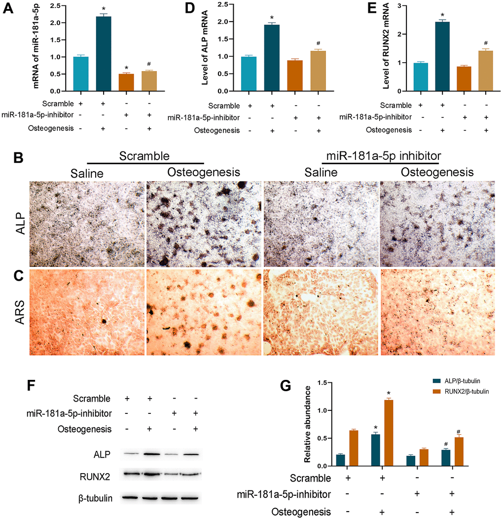 Then, we observed the ALP activity and ARS-detected mineral deposition in two modified groups at the end-time point of osteogenesis. In comparison to the scramble group, miR-181a-5p inhibition significantly suppressed ALP and ARS staining signals (Figure 3B, 3C). Consistently, significant downregulations of ALP and RUNX2 were noticed when miR-181a-5p was inactivated (Figure 3D–3G). These results suggested that miR-181a-5p inhibition impaired MC3T3-E1 cell osteogenic differentiation and reduced extracellular mineral formation.