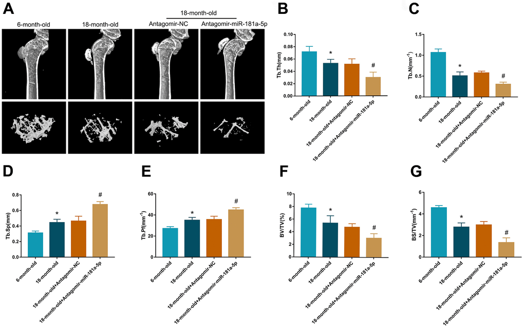 The senile osteoporosis mouse model is a popular method for studying age-related declines in osteogenic potential [17, 18]. We used 6- and 18-month-old mice to establish the senile osteoporosis model with tibia trabecular bone loss, which was mainly characterized by microcomputed tomography (CT). Application of the antagomir-miR-181a-5p and the antagomir-control were conducted for four weeks to further validate our findings in vivo. Age-related trabecular bone loss and microarchitecture deterioration were presented in mice aged 18 months compared to those aged six months (Figure 5A). Suppression of miR-181a-5p further decreased trabecular bone mass and worsened trabecular microarchitecture, with declines in trabecular thickness, number, bone volume fraction, and bone surface density, as well as enhancements in trabecular separation and pattern factor (Figure 5A–5G). These data implied that miR-181a-5p blockade aggravated senile osteoporosis in mice.