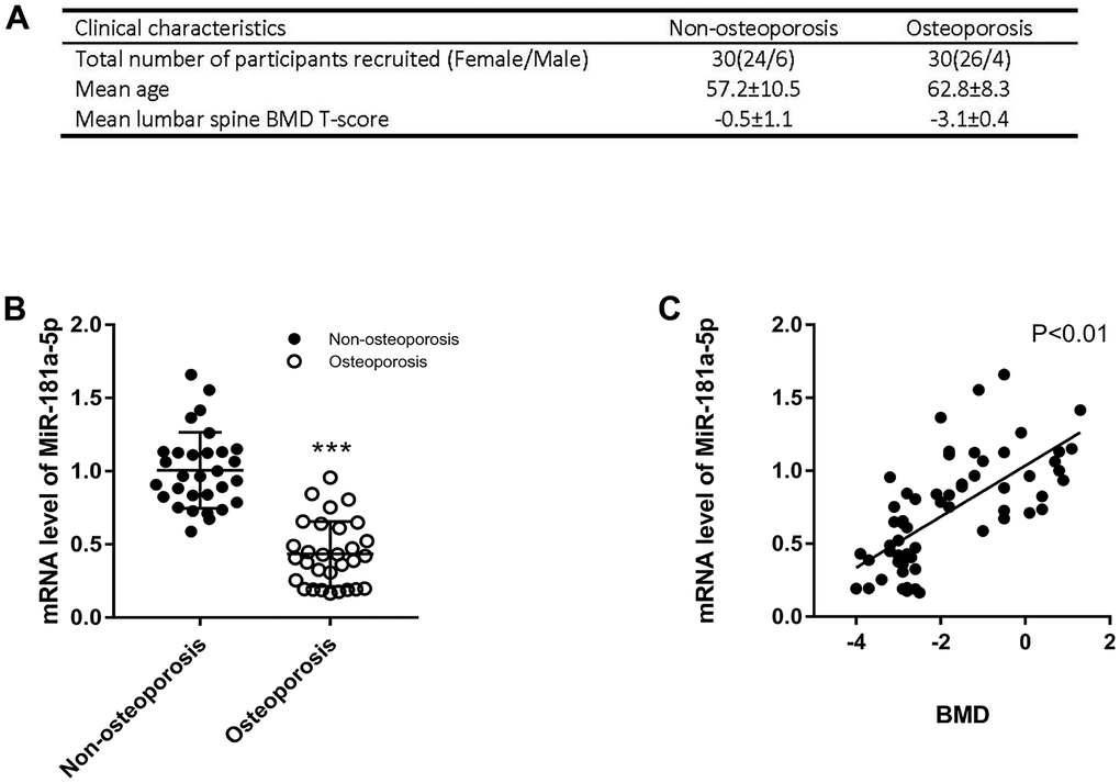 Individuals were recruited in our hospital following the widely recognized definition of osteoporosis [20]. Based on our clinical cohort of 30 osteoporotic and 30 non-osteoporotic patients, we extracted RNA from plasma following a permitted protocol and detected miR-181a-5p. Related information and characteristics were presented in Figure 7A. In accordance with the results of the GEO dataset, it was remarkably reduced in osteoporotic patients, as assessed by polymerase chain reaction (PCR) (Figure 7B). Moreover, a substantial positive correlation between the expression and the spine bone mineral density (BMD) was found in Figure 7C. Taken all these together, miR-181a-5p decreased in osteoporotic patients and was positively correlated with BMD.