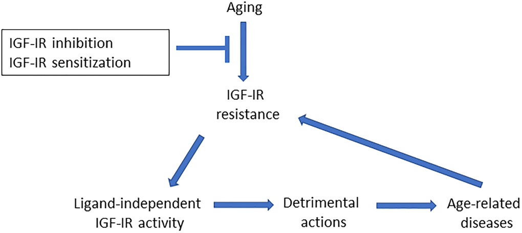 Decades ago, the insulin family of proteins, highly conserved along phylogeny, was established as genetic determinants of aging [1], an observation that, at that time, profoundly impacted theories of aging, and was accommodated into the former concept of antagonistic pleiotropy in aging and subsequent refinements [2]. The detrimental action on aging of insulin-like peptides (ILPs) signaling observed in invertebrate models, particularly the worm C. elegans and the fly D melanogaster, was later replicated in mammalian models, mostly in the mouse, and even included human observations [1]. While the constraints of these translational attempts from invertebrate models to mammals have been already discussed [3], mainstream thinking poses ILPs (in particular insulin and insulin-like growth factor I, or IGF-I) as detrimental in the aging process in all species, even though aging is now considered a multi-factorial and context-dependent process [2]. The latter may explain the large diversity of findings describing changes in ILP activity in the aging mammalian brain, where increased, reduced, or even unaltered ILP receptor activity have been reported in numerous publications, probably reflecting cell- and context-dependent activity of ILPs. On top of these variety of observations, to the best of our knowledge, the majority of IGF-I effects documented in the aging brain are beneficial, while the opposite seems true with the IGF-I receptor (IGF-IR). To reconcile these apparently opposing observations we postulated that aging is associated to IGF-I resistance leading to defective IGF-I functioning. We will elaborate this notion further.