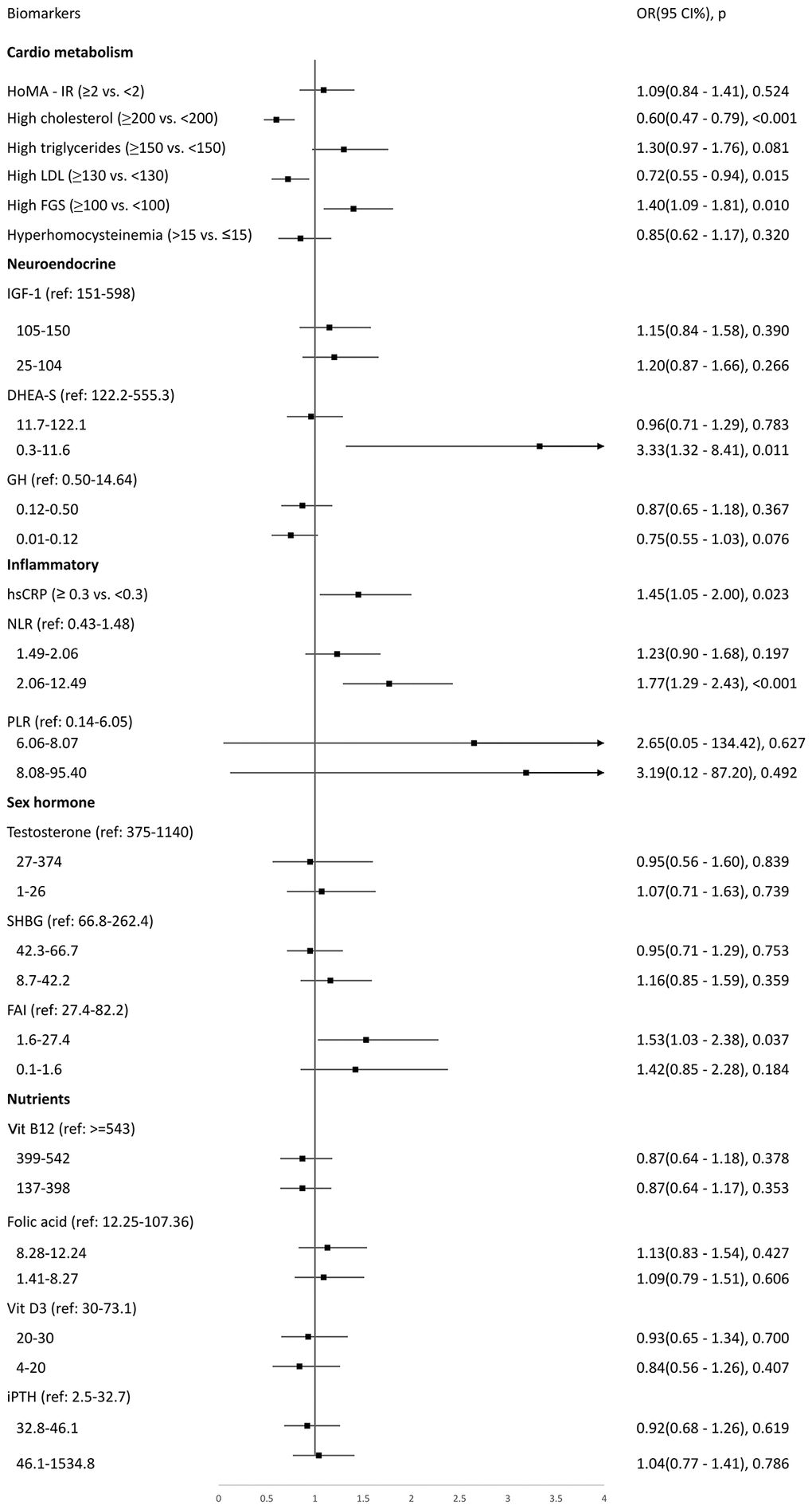 Potential confounding variables were identified from previous literature, which included age, sex, education years, smoking and alcohol consumption in the past six months (yes versus no). The burden of disease was assessed by Charlson’s comorbidity index (CCI) [43]. Venous blood samples were collected from all ILAS participants after a 10-hour overnight fast. Biomarkers related to cardiometabolic health, hormones and biochemistry were tested for all participants, including fasting glucose, total cholesterol, triglycerides, LDL, insulin level, and homeostasis model assessment-insulin resistance (HOMA-IR)-insulin resistance. Inflammatory biomarkers (NLR, platelet-to-lymphocyte ratio, homocysteine, and hsCRP), age-related hormones (growth hormone, IGF-1, DHEA-S, testosterone, sex hormone binding globulin (SHBG), intact parathyroid hormone, and micronutrients (vitamin B12, folic acid and vitamin D, measured by 25-OH vitamin D) were also tested for all participants. Details of the machine, limit of detection, and intra- and inter-assay coefficients of variation for serum biomarkers are shown in the appendix (Supplementary Table 3). The free androgen index (FAI) was calculated from testosterone and SHBG [44].