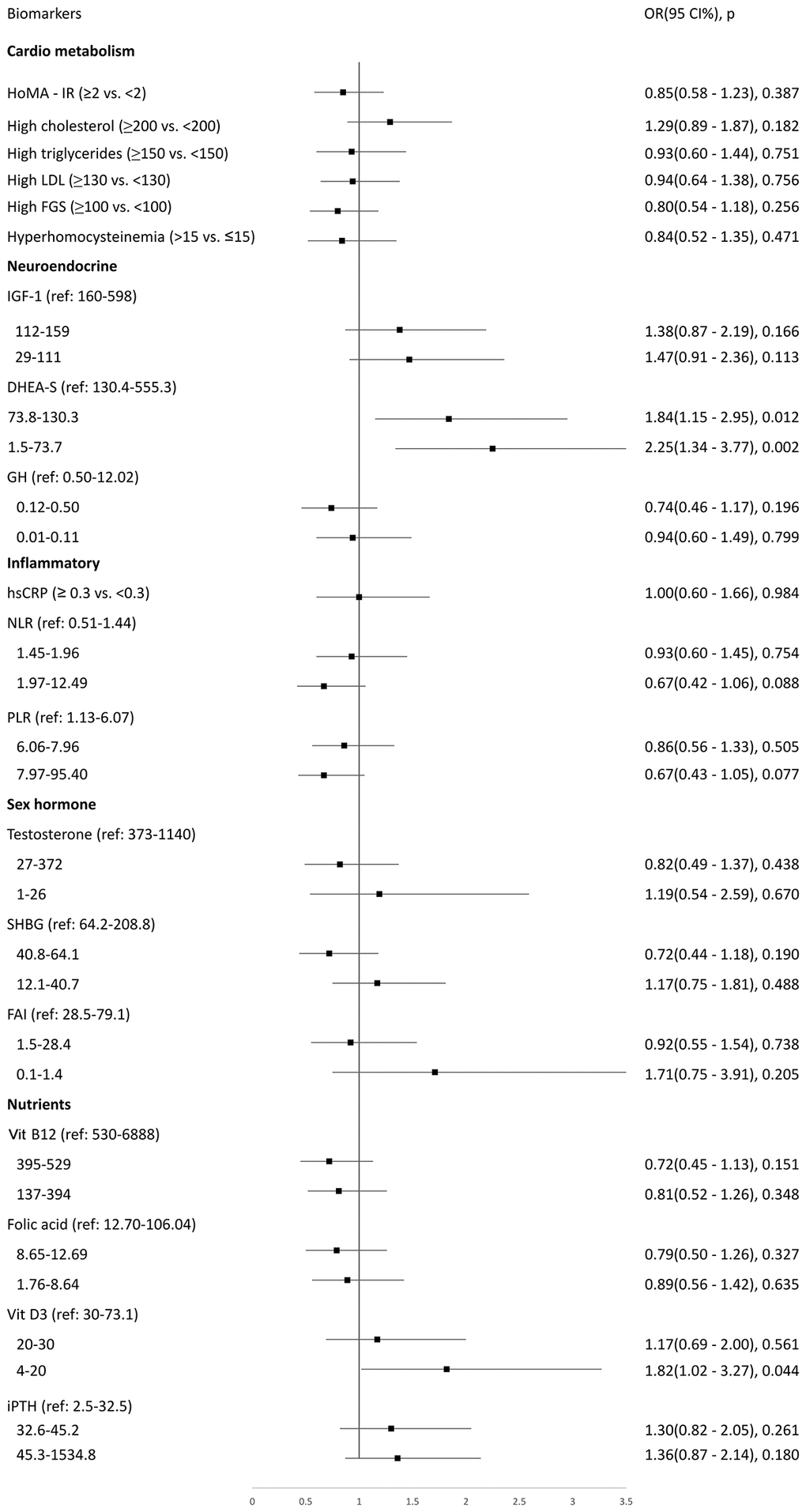 Biomarkers were dichotomized based on definitions used in previous literature: HOMA-IR (≥2 vs. <2) [45], high cholesterol (≥200 or taking lipid lower drugs vs. <200 mg/dL) [46], high triglycerides (≥150 or taking lipid lower drugs vs. <150 mg/dL) [46], high LDL-C (≥130 or taking lipid lower drugs vs. <130 mg/dL) [46], high fasting blood glucose (≥100 or taking oral anti-diabetic drugs vs. <100 mg/dL) [46], hyperhomocysteinemia (>15 vs. ≤15 μmol/L), and hsCRP (≥0.3 vs. <0.3 mg/dL) [47]. All other biomarkers, including the FAI, were tertilized [44]. Vitamin D insufficiency and deficiency were defined by 25-OH vitamin D <20 and <10 ng/mL, respectively [29].