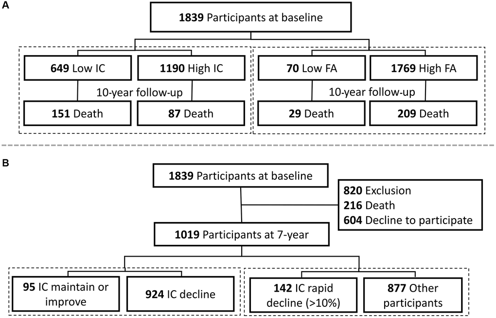 To address the abovementioned knowledge gaps, the study aimed 1) to examine the association between declines in IC or FA and 10-year mortality risk and 2) to further explore the biological features of IC based on its longitudinal changes.
