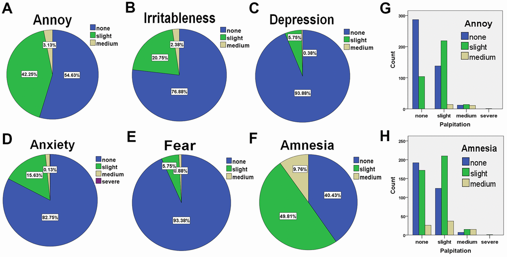 To identify the interrelated factors in HHD, we first checked if the mental disorders are correlated with palpitation in hypertensive patients. Different psychiatric indexes were checked from 800 cases randomly selected. We found the patients suffering annoy or amnesia approximately presented in half of the cases, patients suffering slight or medium mental annoy accounted for 45.38% in total, and patients with slight or medium amnesia accounted for 59.57% in total. However, the patients who have mental issues as either irritableness, depression, anxiety, or fear accounted for less than 25% of patients (Figure 2A – 2F and Supplementary Table 4A–4F). The high incidence rates of annoy and amnesia drove us to check if any correlations existing between these 2 mental symptoms and cardiac palpitation. Cross-tabulation was performed for patients with palpitation and patients with annoy or amnesia. It was found that patients with palpitation are significantly associated with patients with annoy (Figure 2G and Supplementary Table 5A, 5B). 25 cases out of a total 37 cases with medium palpitation also presented the symptom of annoy (67.6%) and 233 cases out of a total 371 cases with slight palpitation also presented the symptom of annoy (62.8%). This was similar for amnesia, the palpitation is significantly associated with amnesia in all patients (Figure 2H and Supplementary Table 5C, 5D). 30 cases out of a total 37 cases with medium palpitation also presented the amnesia (81.1%), and 247 cases out of a total 371 cases with slight palpitation also presented either slight or medium amnesia (66.6%). All the data suggested a positive correlation exists between palpitation and annoy/amnesia presented in hypertensive patients.