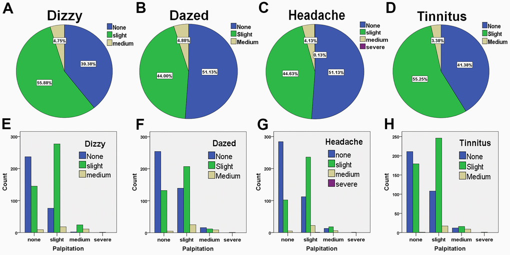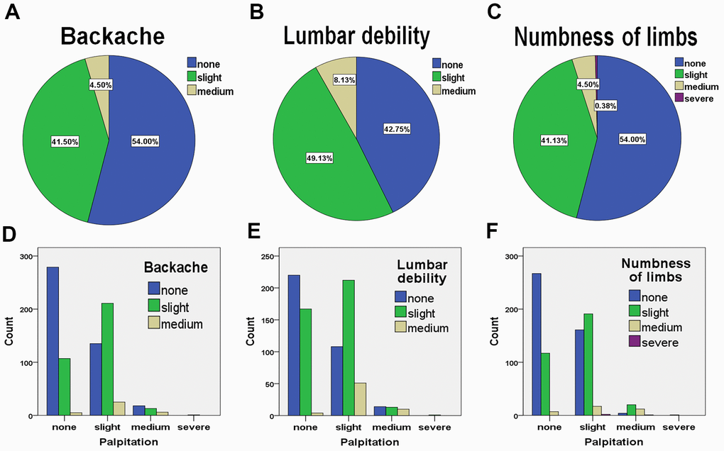 Roughly 46% - 89.2% of patients suffered physical discomforts. In particular, patients suffering slight or medium backache accounted for 46% in total; patients suffering slight or medium lumbar debility 57.26% in total; and patients suffering numbness of limbs 46% in total (Figure 3A–3C and Supplementary Table 6A–6C). To assess the correlation between these physical disorders and palpitation, we performed cross-tabulation for patients with palpitation and patients with backache, lumbar debility or numbness of limbs. It was found that patients with palpitation were significantly correlated with patients with either backache and lumbar debility, or numbness of limbs (Figure 3D, 3F and Supplementary Table 7A–7F). A total of 236 cases out of 371 cases with slight palpitation suffered the symptoms of backache (63.6%); a total of 263 cases out of the 371 cases suffered the symptoms of lumbar debility (70.9%); a total of 210 cases out of the 371 cases suffered the symptoms of numbness of limbs (56.6%). A total of 23 cases out of 37 cases with medium palpitation suffered the symptoms of lumbar debility (62.2%); a total of 33 cases out of 37 cases suffered the symptoms of numbness of limbs (89.2%). Only one patient with severe palpitation suffered all the symptoms (back pain, lumbar debility and numbness of limbs). These results implied that the hypertensive patients with combined palpitation are susceptible to body disorders. This evidence is helpful for primary screen over cardiac complications in hypertension cohort.