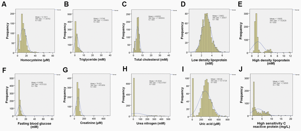 Blood routine lab is important for its accessibility and informativeness in hypertension management. We analyzed the 10 common indexes in blood routine from randomly selected 800 patients with hypertension (Supplementary Table 10 and Figure 5A–5J) and statistically checked their correlations with cardiac palpitation by SPSS Statistics 23. We found there were significantly positive correlations between palpitation and either homocysteine, total cholesterol, creatinine or uric acid (Supplementary Table 11A–11D), and the significantly negative correlations between palpitation and either triglyceride or high-density lipoprotein (Supplementary Table 11E, 11F).