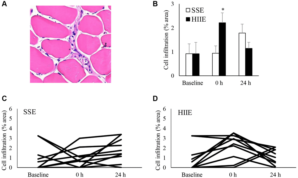 Cell infiltration is a hallmark of muscle inflammation after injuries. Figure 1 shows the amount of cell infiltration in human skeletal muscle following an acute bout of SSE or HIIE. A representative hematoxylin and eosin stain (HE) stains of muscle cross-section is shown in Figure 1A. At pre-exercise baseline, approximately 1% area of nucleated cell aggregation in collapsed and shrinking myofibers was observed for the entire muscle cross-section among the young sedentary participants. HIIE doubled the amount of cell infiltration (d = 1.00; p < 0.05) in skeletal muscle immediately after exercise and returned to baseline within 24 h (Figure 1B). SSE produced a minimal response of cell infiltration 24 h after exercise (not significant), particularly for those participants with low pre-exercise cell infiltration. Individual responses of cell infiltration against SSE and HIIE are shown in Figure 1C and 1D, respectively.