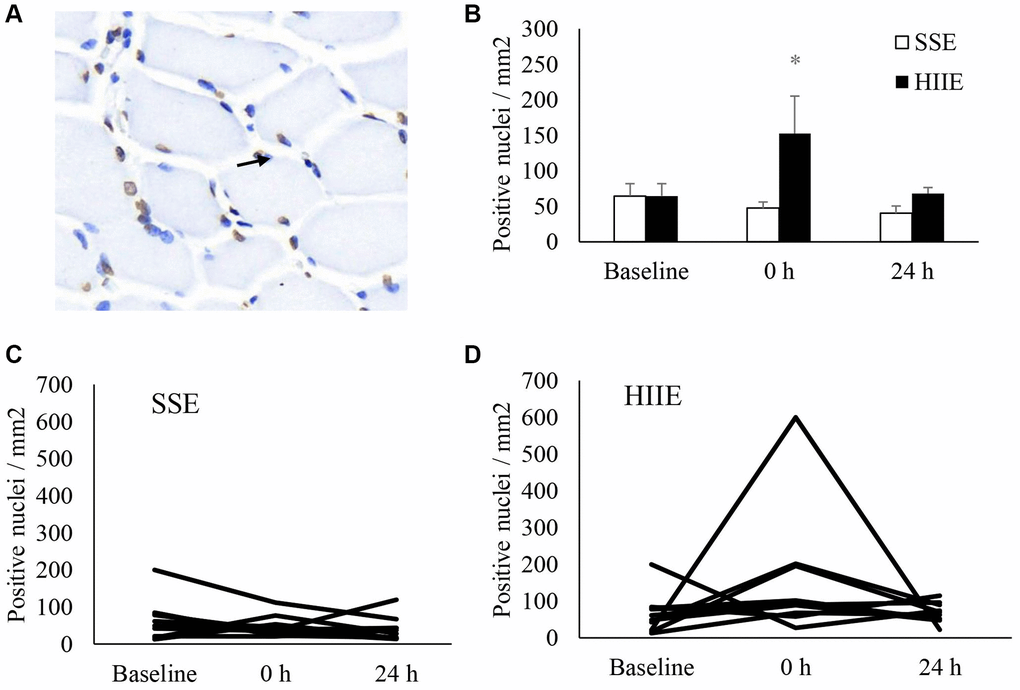 Figure 3 represents DNA strand break (TUNEL assay) of muscle cross-section after HIIE. Before exercise, fragmented DNA was detected in both morphologically normal myofibers and the nucleated cells outside myofibers at a roughly similar proportion (Figure 3A), indicating a dynamic balance of DNA strand break and repair in normal nuclei of human skeletal muscle. Increased amount of these fragmented DNA (+1.3-fold, d = 0.77, p < 0.05) was observed immediately after HIIE and returned to baseline in 24 h (Figure 3B). The individual responses of DNA fragmentation to HIIE and SSE trials are shown in Figure 3C and 3D.