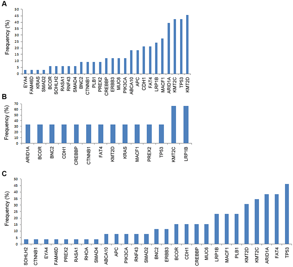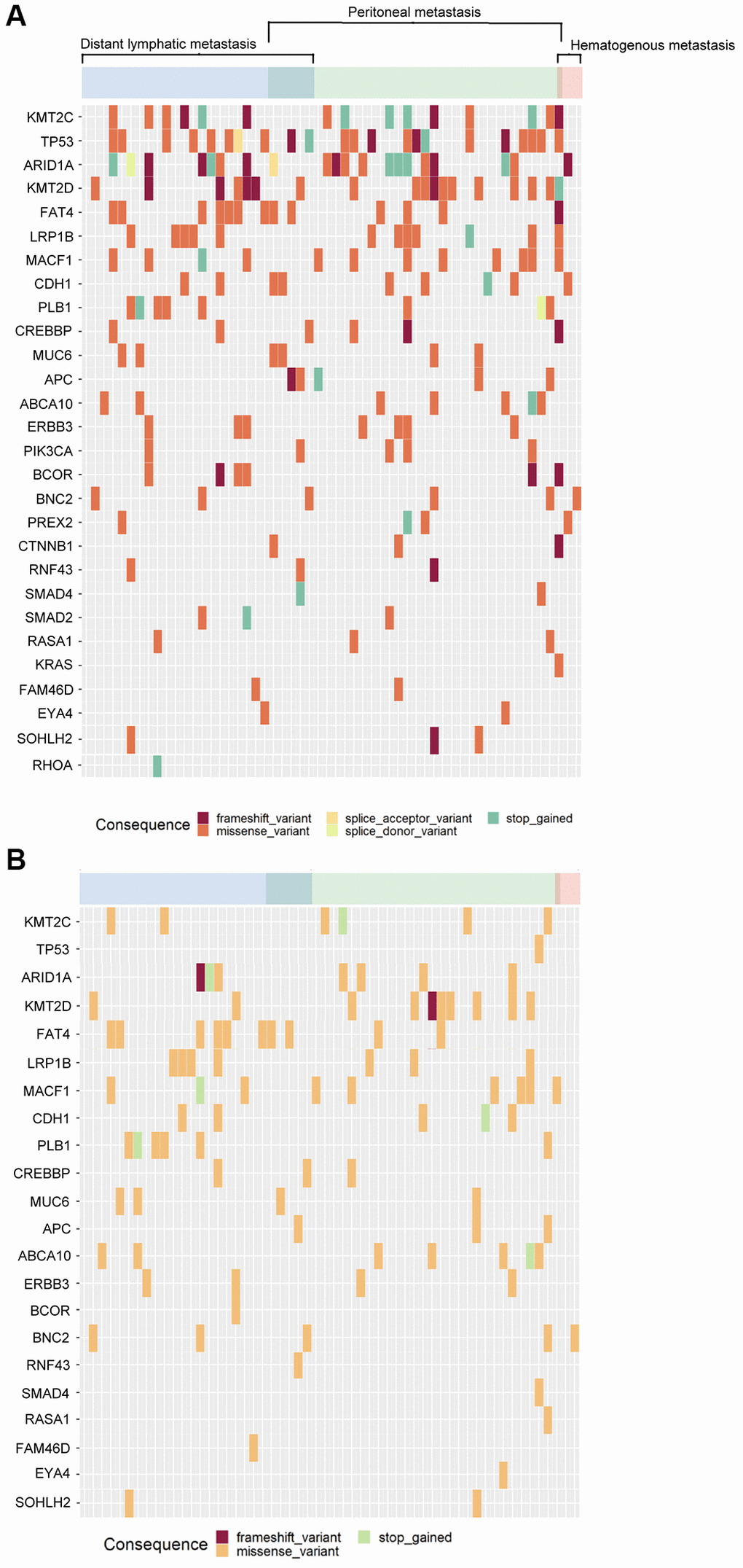 We analyzed the genetic mutation according to the metastatic sites. As shown in Figure 1A, for patients with peritoneal metastasis, the most commonly mutated gene was KMT2D (45%), followed by TP53 (42%), KMT2C (42%), ARID1A (39%), MACF1 (27%), LRP1B (24%), FAT4 (21%), CDH1 (21%), APC (18%), and ABCA10 (18%). In Figure 1B, for patients with hematogenous metastasis, the most commonly mutated genes were LRP1B (67%) and KMT2C (67%), followed by TP53 (33%), PREX2 (33%), MACF1 (33%), KRAS (33%), KMT2D (33%), FAT4 (33%), CTNNB1 (33%), CREBBP (33%), CDH1 (33%), BNC2 (33%), BCOR (33%), and ARID1A (33%). In Figure 1C, for patients with distant lymphatic metastasis, the most commonly mutated gene was TP53 (46%), followed by FAT4 (38%), ARID1A (38%), KMT2C (35%), PLB1 (31%), MACF1 (23%), LRP1B (23%), MUC6 (23%), CREBBP (15%), CDH1 (15%), BCOR (15%), ERBB3 (15%), and BNC2 (15%). The most common mutated spot in both peritoneal and distant lymphatic metastases was KMT2C c.8390delA.