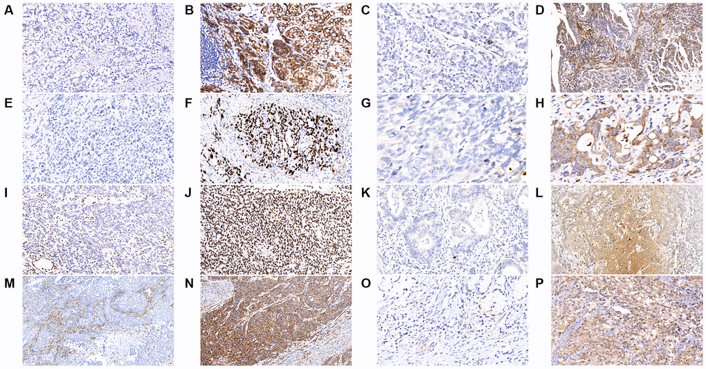 Immunoreactivity E-cadherin was localized in membranes; MACF1 and PLB1 were localized in the cytoplasm and membranes; p53 and ARID1A were localized in the nucleus; KMT2C and FAT4 were localized in the cytoplasm; KMT2D was localized in the cytoplasm and nucleus, and mainly in nucleus (Figure 2). Immunoreactivity of at least 10% of tumor cells was considered positive staining.