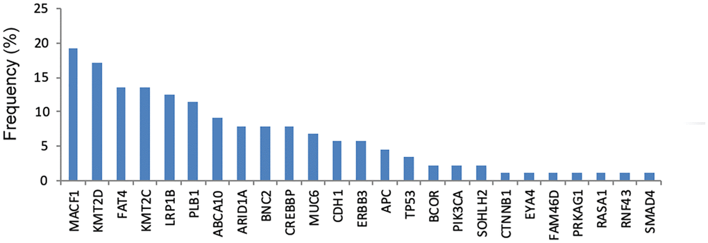 | TP53 | ARID1A | KMT2C | KMT2D | FAT4 | LRP1B | MACF1 | CDH1 | PLB1 | |||||||||||||||||||||||||||||||||||||||||||||||||||||||||||||||||||||||||||||||||||||||||||