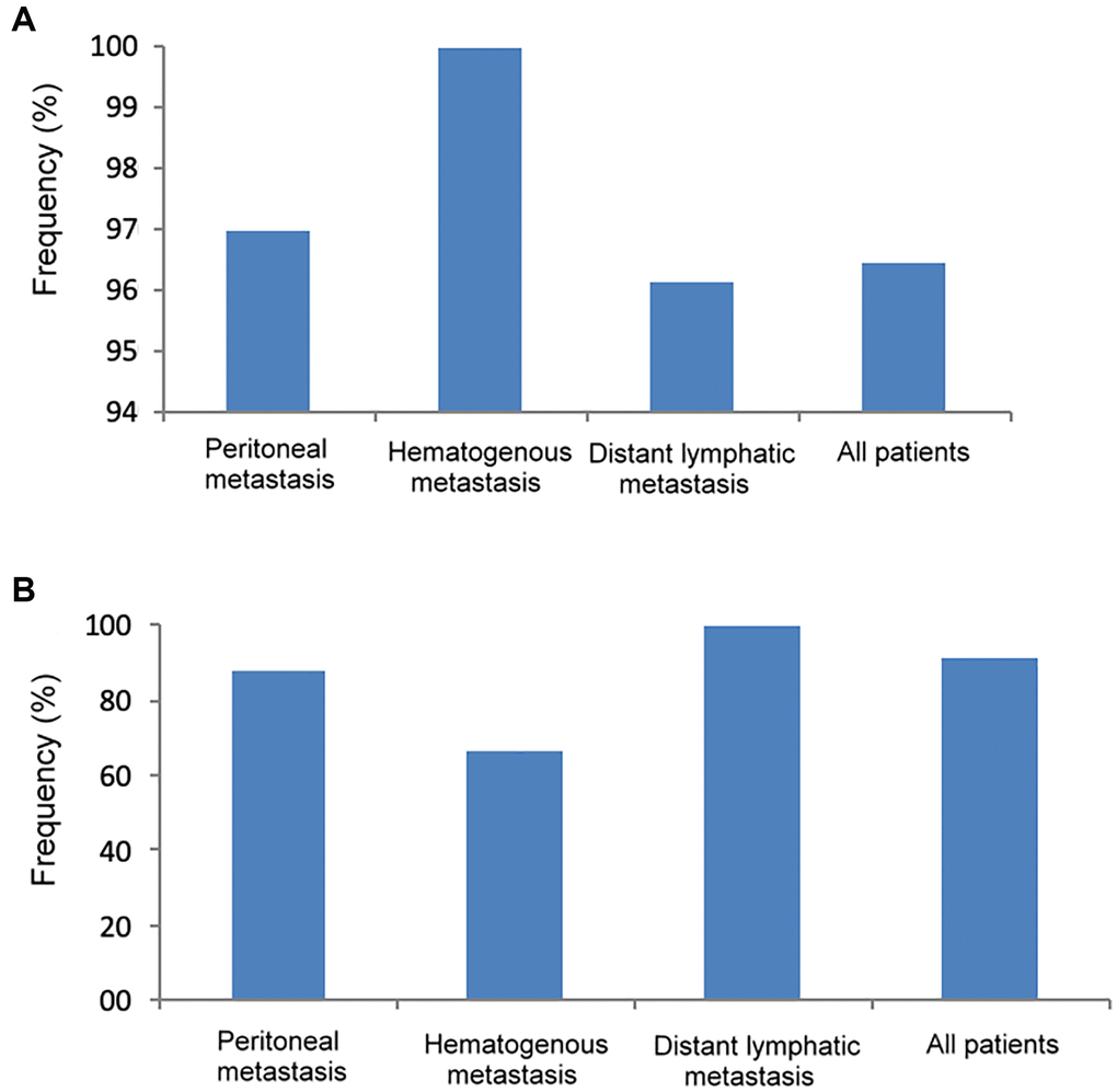 As shown in Figure 4A, the frequency of genetic mutations (at least one gene mutation) in tumor DNA was highest in patients with hematogenous metastasis (100%), followed by peritoneal metastasis (97%) and distant lymphatic metastasis (96.2%). In Figure 4B, the frequency of genetic mutation in cfDNA was highest in patients with distant lymphatic metastasis (100%), followed by peritoneal metastasis (87.5%) and hematogenous metastasis (66.7%).
