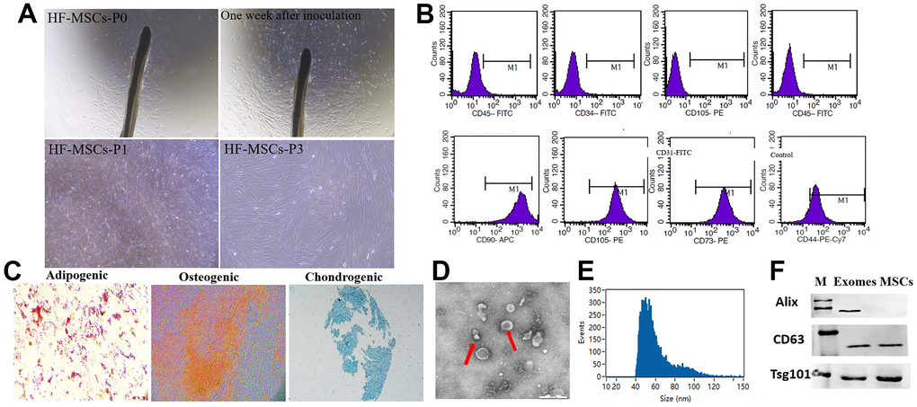 Exosomes were isolated by ultracentrifugation from HF-MSC cells using 2% (w/v) exosome-deprived FBS. TEM illustrated that HF-MSCs produced vesicles with a distinct cup-shaped morphology (Figure 1D). According to nanoparticle tracking analyses, the particle size distribution of the vesicles was about 85 percent, ranging between 20 and 200 nm (Figure 1E). Western blotting revealed the existence of the exosomal marker proteins Alix, CD63, and Tsg101 (Figure 1F).
