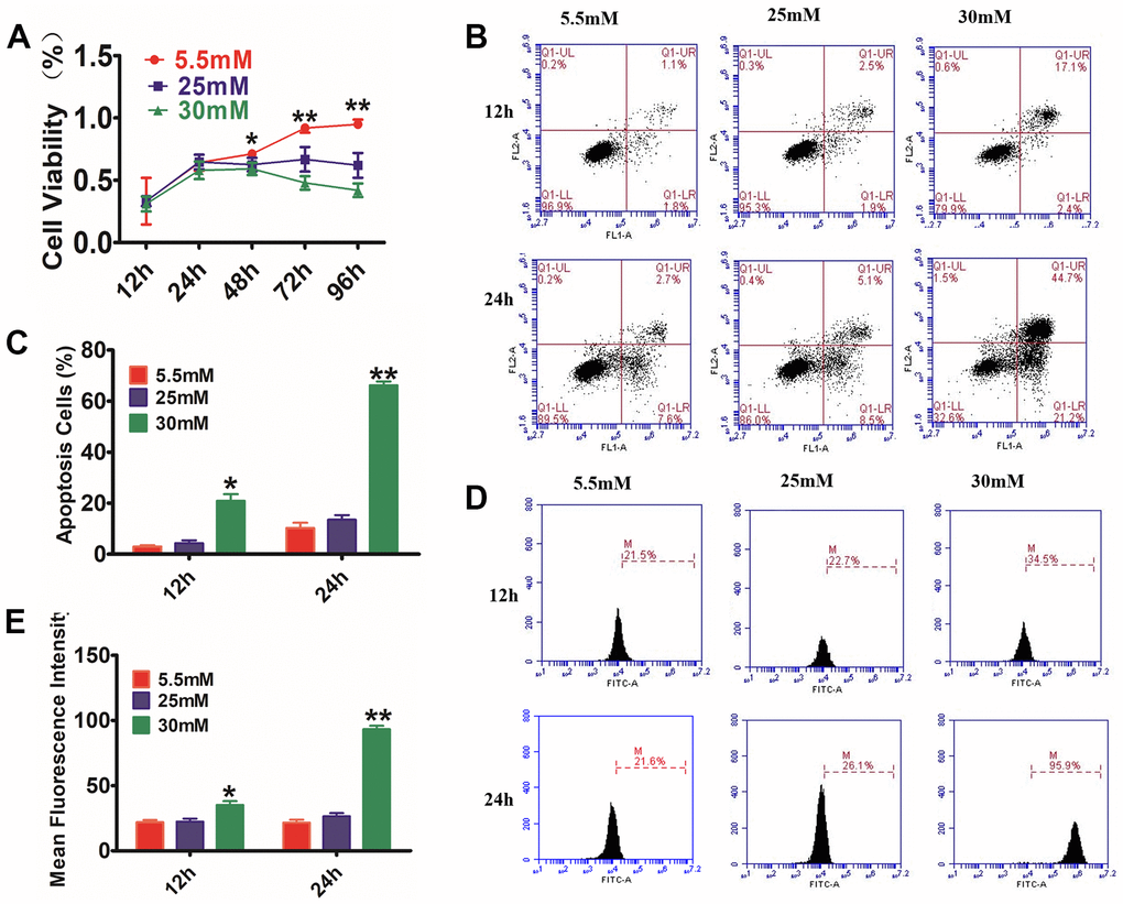 To determine the mechanism of the effects of exosomes on diabetic wounds, HaCaT cells were used to make the model chronic. HaCaT cells were treated with LG (5.5 mM) or HG (25 or 30 mM)12h to 96h. The CCK8 assay (Figure 2A) showed that HG stimulation resulted in a remarkable decrease in cell viability. Annexin V-PI staining in combination with flow cytometry assay (Figure 2B, 2C) illustrated that the proportion of PI-positive cells and annexin V-positive cells increased with time and concentration, being considerably higher compared with that in the control cohort (P<0.01). The ROS detection (Figure 2D, 2E) showed that the fluorescence intensity of ROS dramatically increased as early as 12 h after treatment with HG, being substantially higher compared with that of the control cohort (P<0.05); it continuously increased with time, reaching a maximum at 24 h.