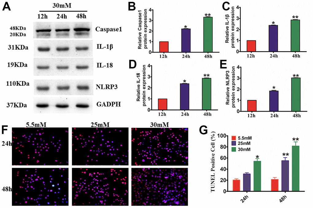 The ASC, NLRP3, and caspase-1 multiprotein complex NLRP3 inflammasome are widely recognized as the primary pathway of inflammation and pyroptosis following cell damage. To examine the impact of Exo on the activation of NLRP3 inflammasomes in vivo, we first needed to study the injury model produced by treating HaCaT cells with HG. We found that HG treatment enhanced the activation of caspase-1 and the production of IL-18 and IL-1β. The increased reactivity of HaCaT cells to the inflammasome was supported by NLRP3 inflammasomes (P<0.01) (Figure 3A–3E). TUNEL staining results showed that HG-induced apoptosis increased in a time- and concentration-dependent way (P<0.01) (Figure 3F, 3G). These findings strongly suggest that HG stimulates IL-1β production and caspase-1 activation regulated by the NLRP3 inflammasome in HaCaT cells.