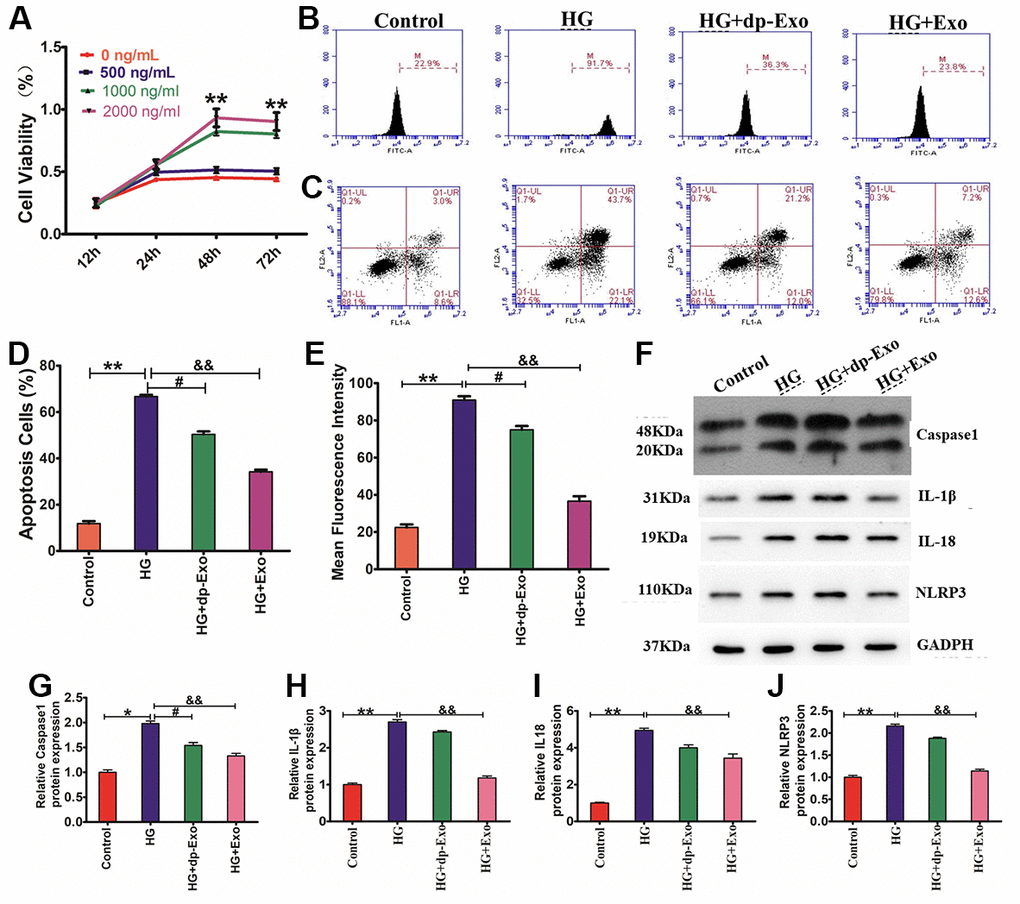Increasing research evidence indicates that paracrine signaling performs an instrumental function in stem cell-based therapy. To investigate the underlying mechanism through which paracrine signaling enhances cutaneous healing of wounds, we made HaCaT cells exposures to H2O2 and then to different concentrations of HFMSCs-Exo for various periods of time. CCK8 assay illustrated that the HaCaT cells cultivated in the presence of HFMSCs-Exo had considerably greater viability as opposed to that of the control cohort (0 ng/ml). Furthermore, the viability of HaCaT cells cultivated in HF-MSCs-Exo exhibited an increase in the dosage range from 500 ng/ml to 2000 ng/ml, and from 12-48 h (Figure 4A). Furthermore, we compared the effect of HF-MSCs-Exo on HG-induced increase in the levels of ROS and apoptotic rate of HaCaT cells with that of HFMSCs-dp-Exo (GW4869) ROS flow cytometry results showed that the mean fluorescence intensity of the cells was reduced more than HG cohort in the HF-MSC-Exo cohort (Figure 4B, 4D). Similar to ROS measurement, the percentage of apoptotic cells in the HF-MSCs-Exo cohort was considerably lesser than that in the HG cohort (Figure 5C, 5E). However, neither the percentage of apoptotic cells nor the intensity of ROS fluorescence showed any significant difference between the HG and HF-MSCs-dp-Exo cohorts (P>0.05). We found that HF-MSC-Exo treatment reduced the activation of caspase-1 and the release of IL-18 and IL-1β. The reduction in the inflammasomes of HaCaT cells was supported by NLRP3 inflammasomes (P<0.01) (Figure 4F–4J). These data clearly indicate that HF-MSC-Exo inhibited IL-1β, IL- 18 production, and activation of caspase-1 and reduced the NLRP3 inflammasome in HaCaT cells.