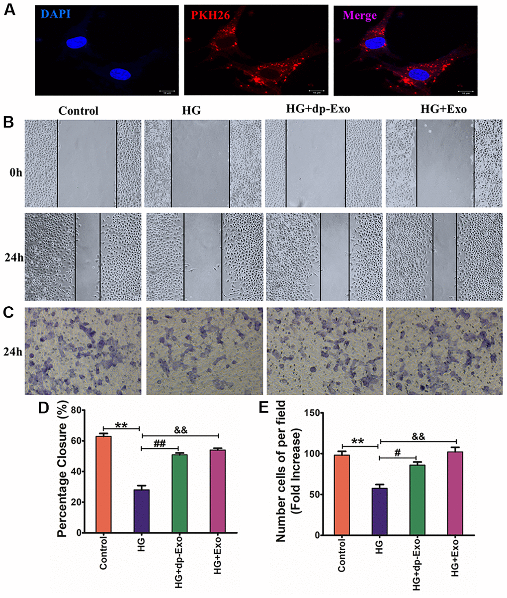 To examine cell migration, transwell and cell scratch tests were conducted [48]. Succinctly, HaCaT cells were plated in the upper chamber of a transwell (8-μm pore filters; Corning, Corning, NY, USA) as per the guidelines provided by the manufacturer. HaCaT cells were plated in 6-well plates at a seeding concentration of 5 × 104 cm2, followed by culturing over the night in DMEM comprising 10 percent (w/v) FBS. In the day that followed, the cells were rinsed thrice in PBS before being cultured in 30 mM glucose DMEM comprising 2 percent (w/v) exosome-free FBS for 24 hours. A 200-μl micropipette tip was utilized to scratch HaCaT cells grown in the 6-well plates. The HaCaT cells cultivated in the 6-well plates and Transwell were rinsed three times in PBS before being cultured for 24hours in DMEM comprising 2 percent (w/v) exosome-deprived FBS, HF-MSCs-dp-Exo, or HF-MSCs-Exo in 6-well plates or 100 μl DMEM comprising 2 percent (w/v) exosome-deprived FBS in the upper Transwell chamber. In the lower Transwell chamber, 600 μl DMEM comprising 2 percent exosome-free FBS, HFMSC-dp-Exo, or 1,000 ng/ml HFMSCs-Exo were added. After the Transwells were taken away from the tissue culture plate, the culture medium in the upper chamber of the Transwell was aspirated ensued by fixing of the HaCaT cells in the Transwells using methanol, drying with a laminar flow hood, and staining with Hoechst 33342 (1:10,000, 25° C, 2 min; Life Technologies, Carlsbad, CA, USA). The HaCaT cells that were left in the upper Transwell chamber were extracted with a cotton tab and washed thrice in PBS. A fluorescent microscope (Olympus) was used to visualize the HaCaT cells that were remained on the lower surface of the top transwell chamber. ImageJ software (NIH, Bethesda, MD, USA) was used to examine HaCaT cells in five view areas chosen at random. Photographs were taken for HaCaT cells cultivated by 6-well plates. Migration under the above-mentioned culture conditions was measured. Computation of the migration rates was done as indicated below: (distance of cells at scratching time point − distance of cells 24 h post-scratching)/(distance of cells at scratching time point).
