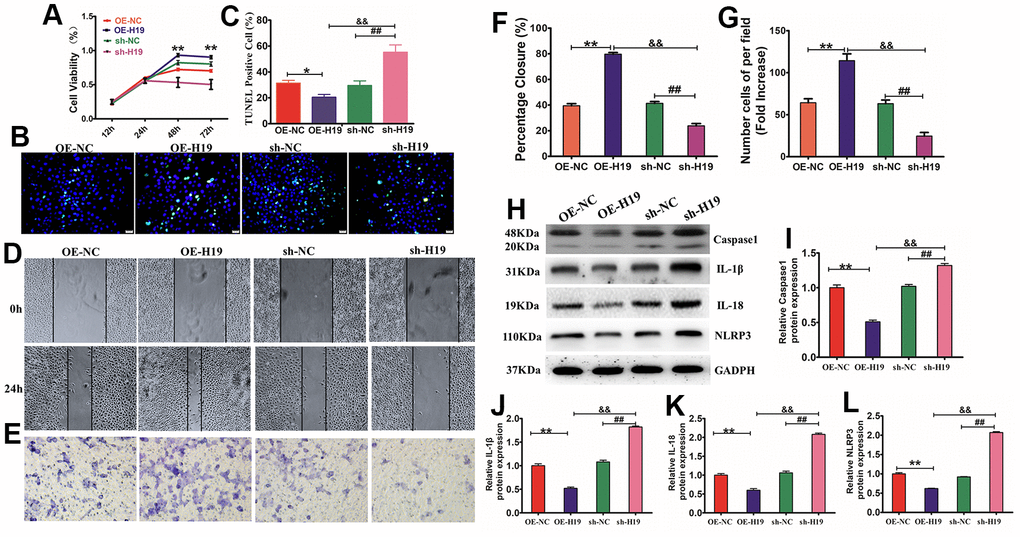 Considering that HF-MSCs-Exo can deliver lncRNA H19 to HaCaT cells through exosomes, the modulatory function of exosomes in proliferation, migration, and apoptosis of HaCaT cells was investigated by incubating HaCaT cells with normal HF-MSCs-Exo (NC) or HF-MSCs-Exo overexpressing H19 (OE-H19) or having downregulated levels H19 (sh-H19). The results showed that OE-H19 delivery promoted HaCaT cell proliferation and migration by suppressing apoptosis, while sh-H19 had the reverse effect (P<0.01), implying that HF-MSC-Exo carrying of lncRNA H19 regulates fibroblast proliferation, migration, and apoptosis (Figure 7A–7G). NLRP3 is considered to be an essential inhibitor of the pyroptosis signaling pathway, which performs a critical function in regulating cell growth, differentiation, proliferation, and apoptosis. Treatment of HG-induced cells with different exosomes showed that OE-Exo inhibited the activation of caspase-1 and GSDMD cleavage. Therefore, lncRNA H19 is also essential for the modulation of the activation of NLRP3 inflammasome and cleavage of GSDMD in HaCaT cells (Figure 7H–7L). In summary, these findings illustrate that the anti-inflammatory benefit of lncRNA H19 in exosomes from HF-MSCs may be an important gene for skin wound healing.