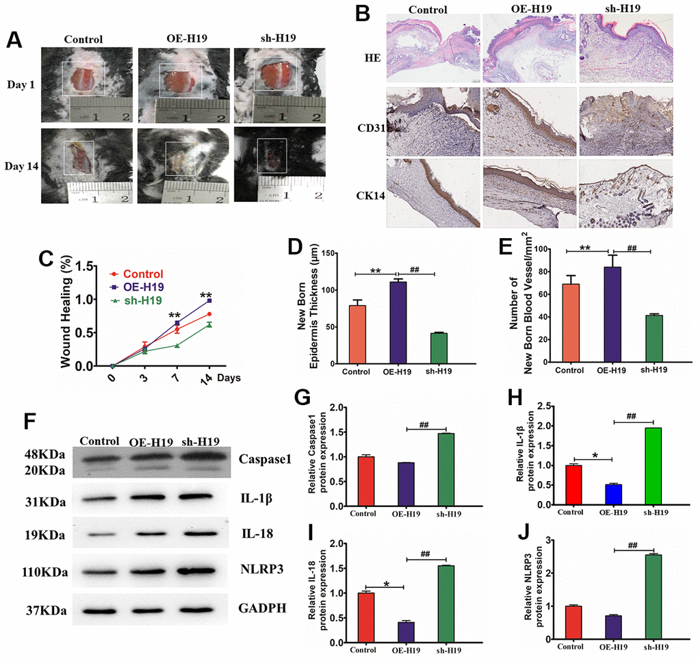 To examine the impact of HF-MSC-Exo in the process of wound repair in diabetic mice, we constructed a diabetic mouse skin wound model and injected the tissues surrounding the wound with HF-MSC-Exo overexpressing H19 (OE-H19) or with downregulated H19 (sh-H19), followed by immunohistochemical and H&E staining to observe wound healing. Exosomes overexpression of H19 (OE-H19) significantly accelerated the wound healing process in vivo, as confirmed by the presence of thicker granulation tissues and fewer inflammatory cells surrounding the wound (Figure 8A–8E). Western blot analysis of the skin wound tissue revealed that treatment with HF-MSC-Exo OE-H19 led to a lower level of caspase1, IL-1β, and TNF-α, illustrating that HF-MSC-Exo overexpressing H19 can mitigate the NLRP3 inflammation of diabetic skin wounds in mice. Therefore, HF-MSC-Exo carrying of overexpressing the lncRNA H19 quicken the process of wound healing in diabetes skin. OE-H19 exosomes protected against HG-induced injury in HaCaT cells by suppressing NLRP3 inflammasome-mediated pyroptosis by inhibiting the protein expression of IL-18, IL-1β, Caspase-1, and NLRP3 P<0.01 (Figure 8F–8J).