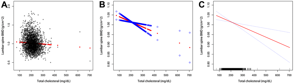 Data were analyzed with the use of the statistical packages R (The R Foundation; http://www.r-project.org; version 3.6.3) and EmpowerStats (https://www.empowerstats.net, X&Y solutions, Inc. Boston, MA). And P values < 0.05 were considered statistically significant. We performed weighted and variance estimation analyses to account for significant variance in our dataset. Weighted multiple logistic regression models were used to assess the association between total cholesterol and BMD of the lumbar spine. We calculated differences between groups using a weighted chi square test for categorical variables or a weighted linear regression model for continuous variables. Subgroup analysis was performed by stratified multiple regression analysis. In addition, smooth curve fitting and generalized additive models were used to address the nonlinear relationship between total cholesterol and lumbar spine BMD. For non-linearity in the model, a recursive algorithm was used to calculate the inflection point in the relationship of total cholesterol and BMD when non-linearity was detected, with a bi segmented linear regression model on either side of the inflection point.